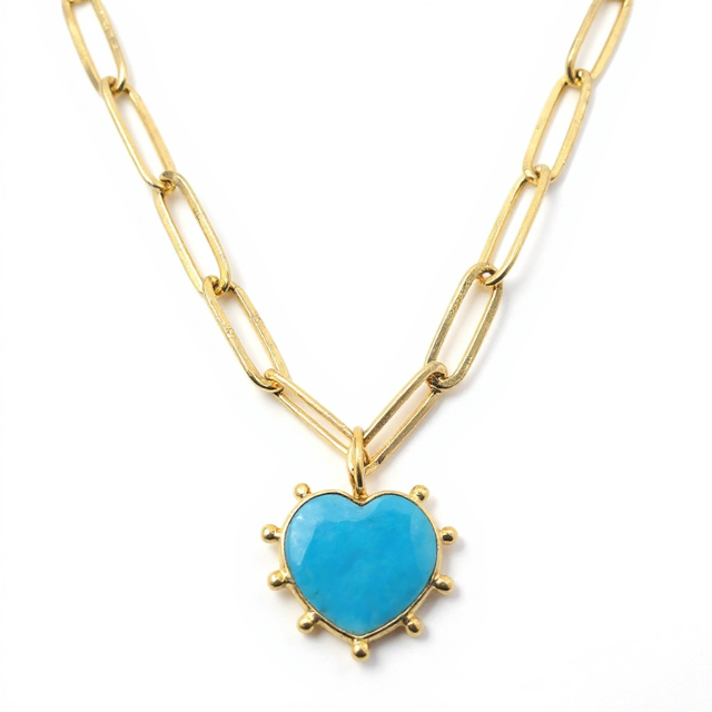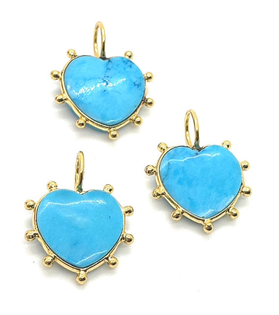 The newest edition to our gemstone charm collection, the Adore charm features a bright blue Turquoise heart set into a fun dotted gold bezel. The loop at the top is generous and allows for easy wear on most chains. Each is unique, color and markings may vary slightly.