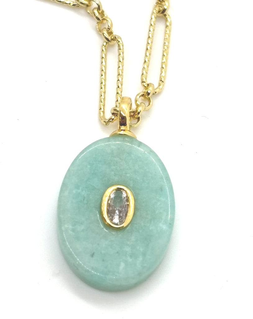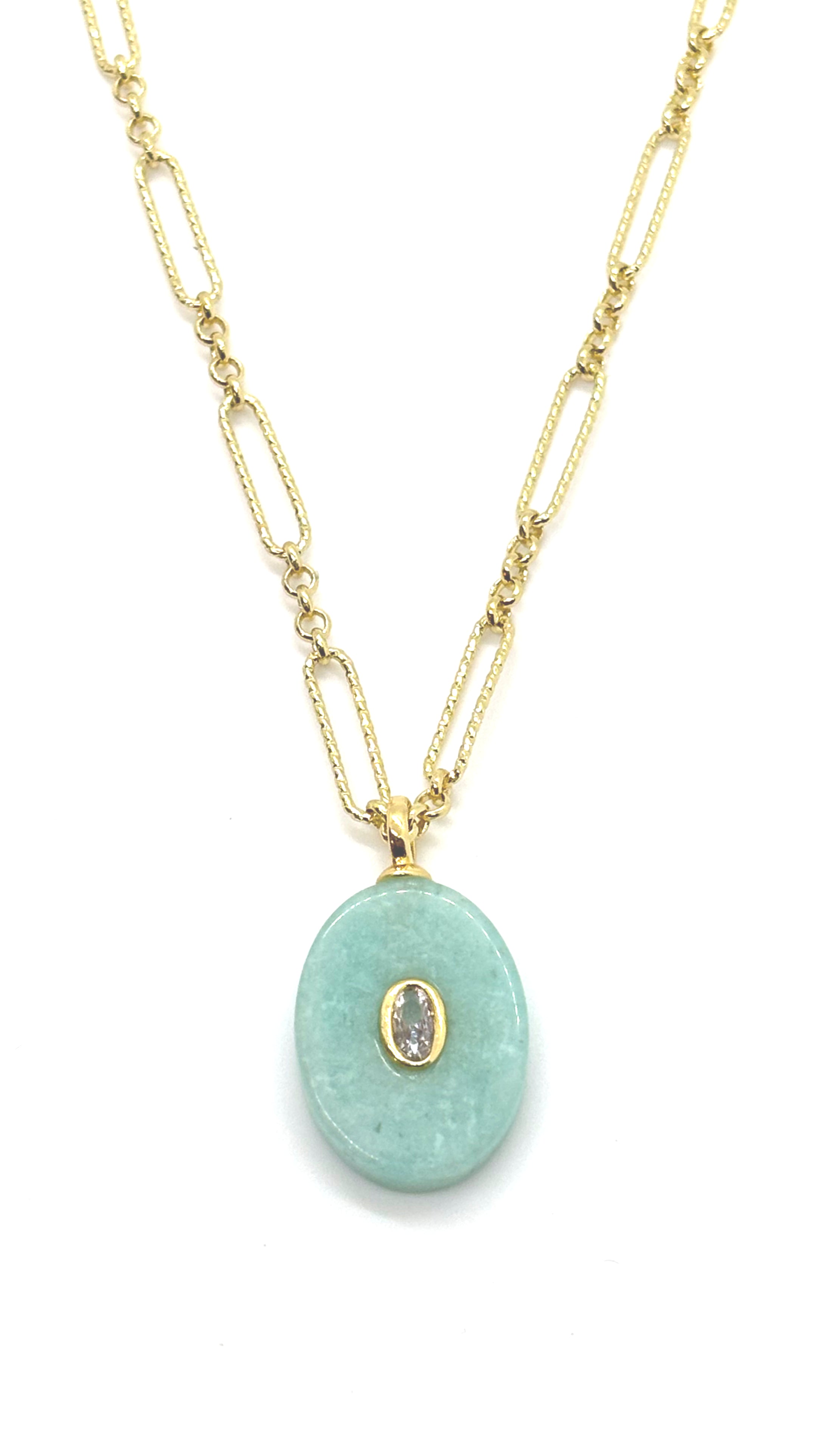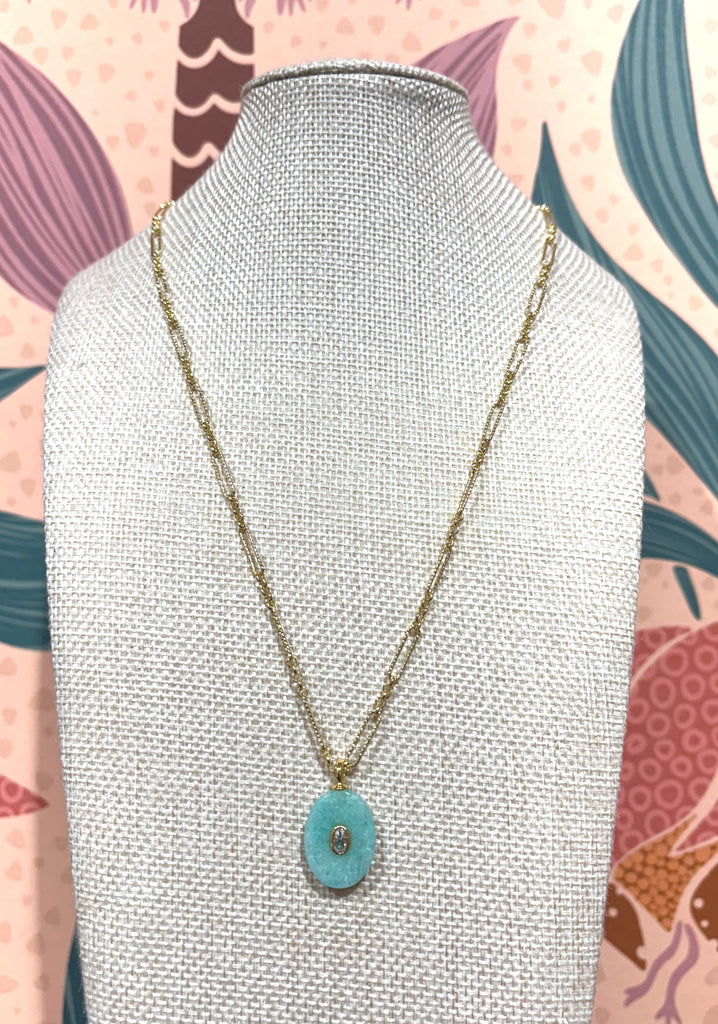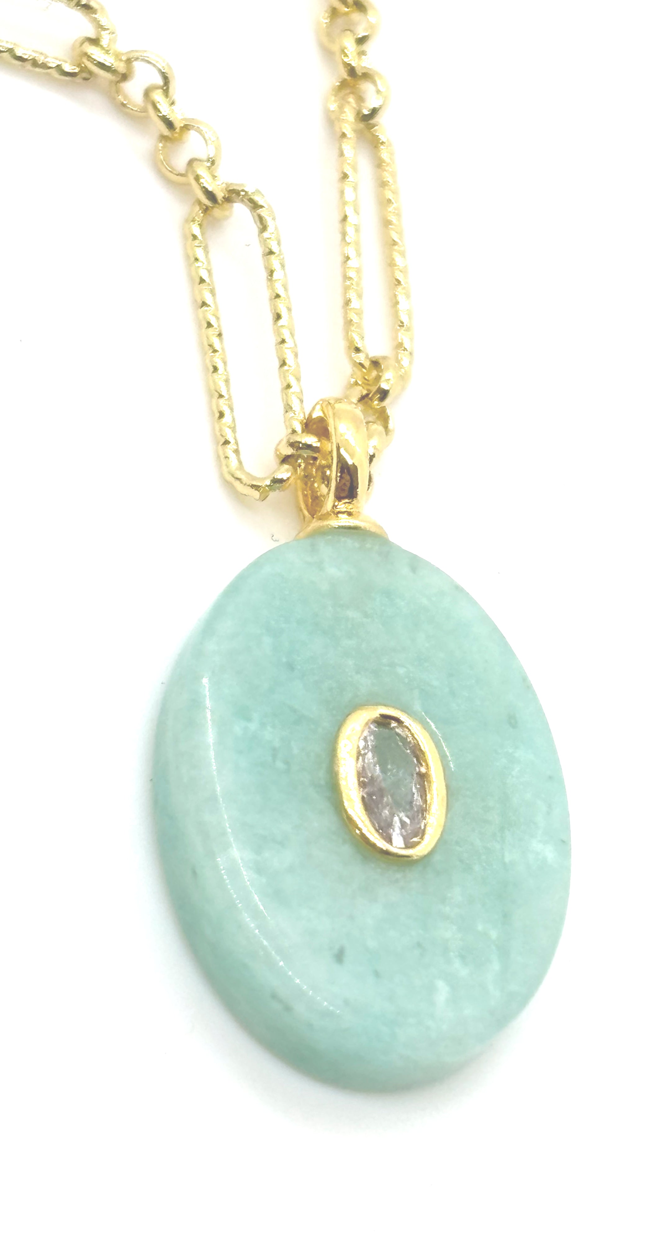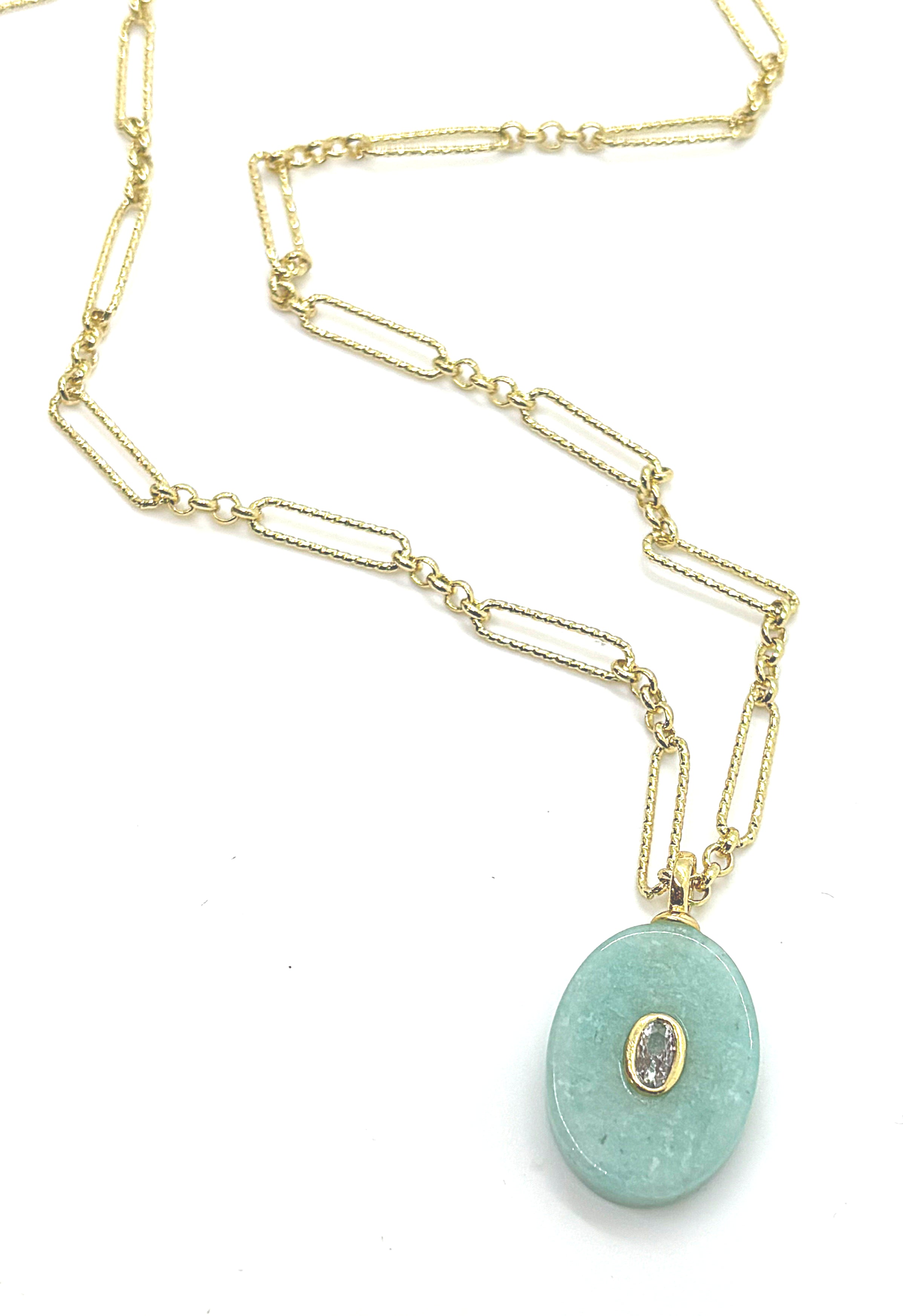 Grounded in natural beauty and timeless style, the Atlantis necklace features a single Amazonite gemstone inlaid with a Topaz center. The charm is removeable from the diamond cut multi shaped link chain. Each stone is unique and color may vary slightly.