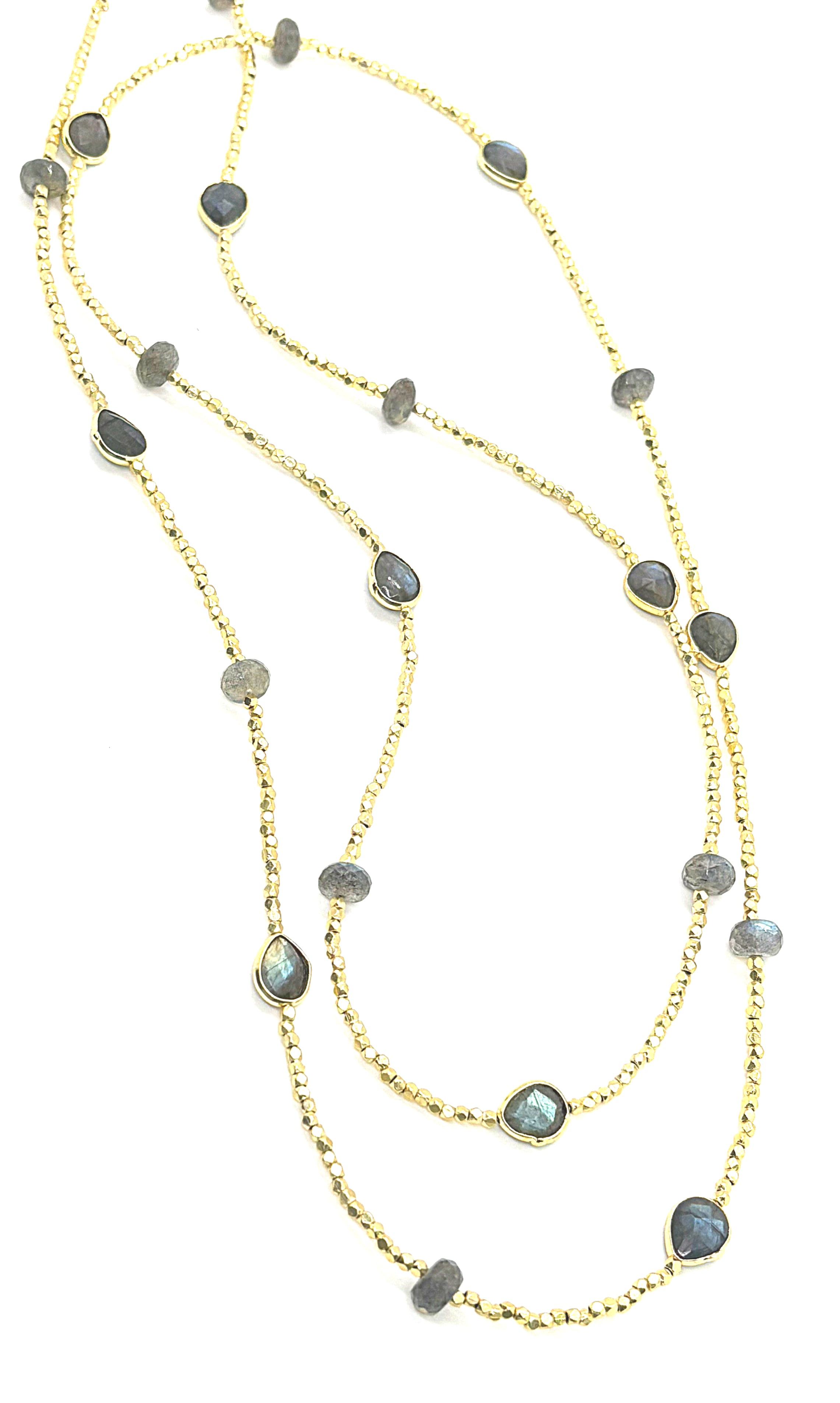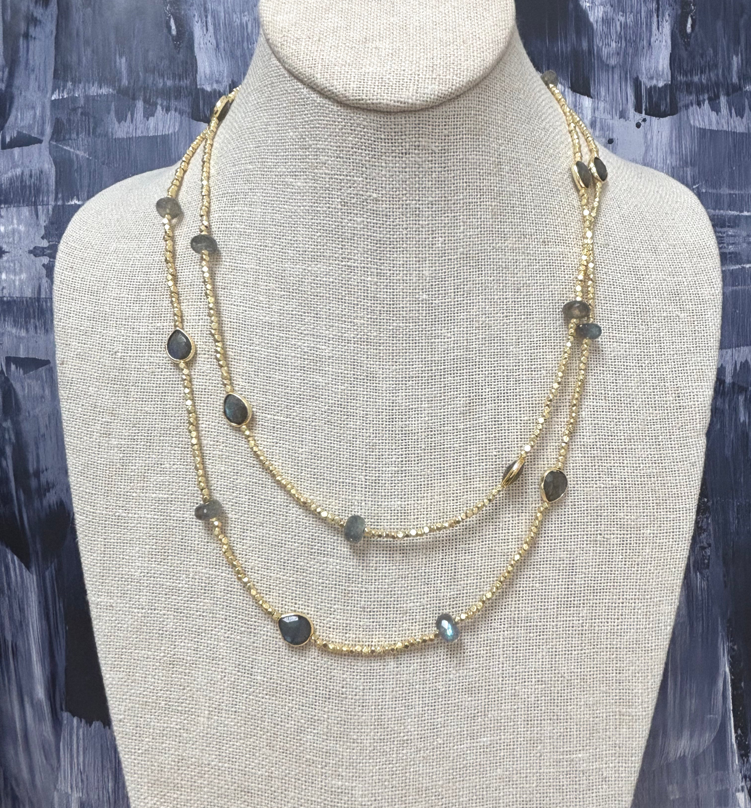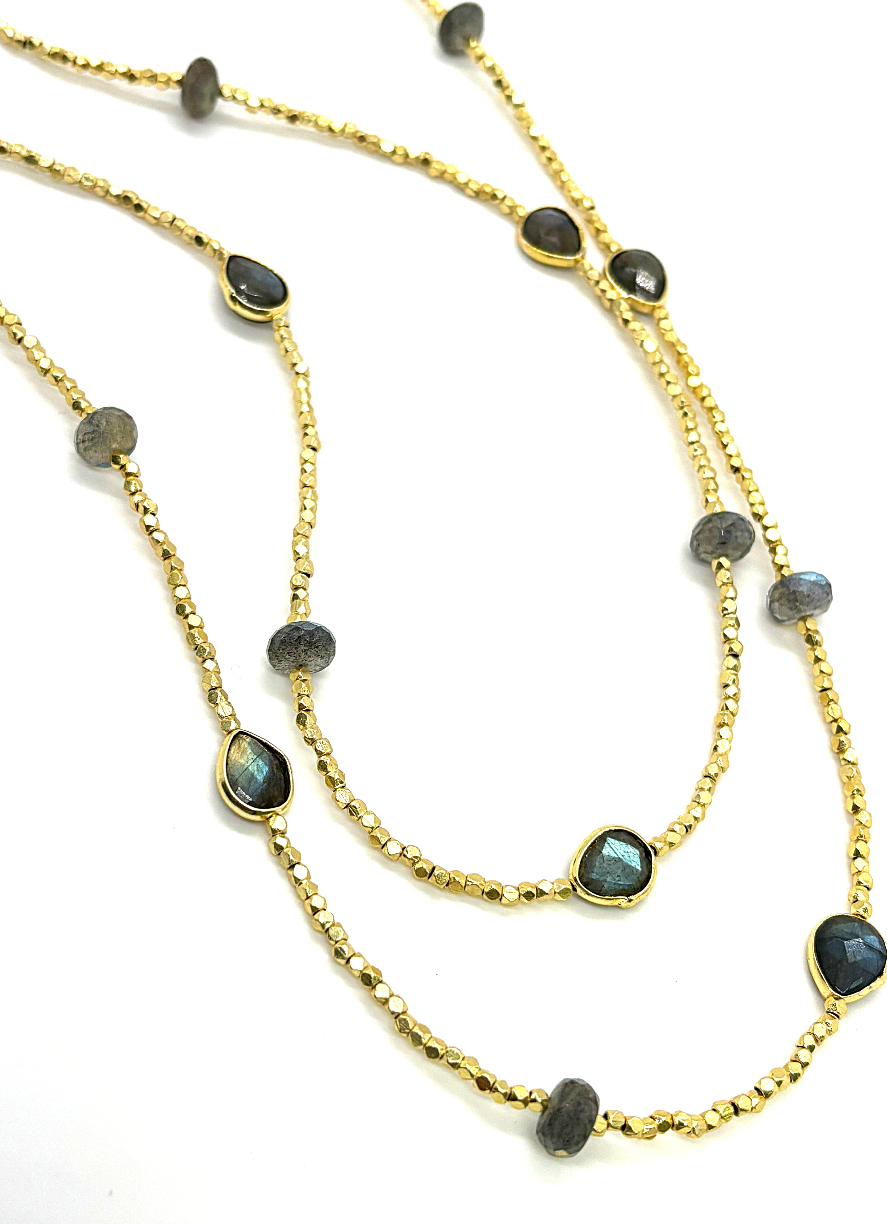 Catch the light with this stunning labradorite necklace, where iridescent gemstones dance between shimmering blues, golds, and greens. Each faceted bead and gemstone is carefully set in elegant bezels and strung on a luxurious gold chain that elevates any look. Labradorite's mesmerizing play-of-color makes this piece a conversation starter that effortlessly complements your everyday style or special occasions.