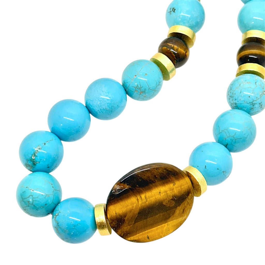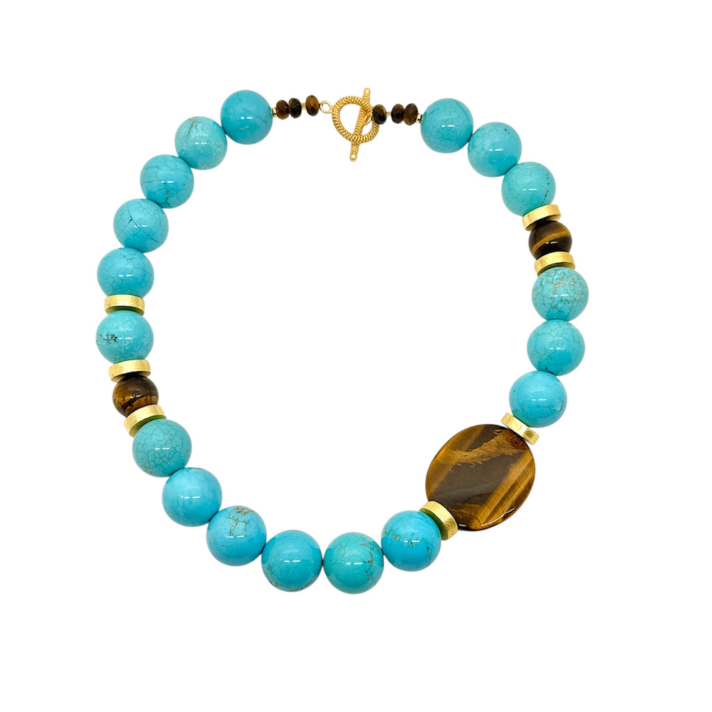 Our Cabo necklace is a blend of coastal color and earthy elegance, featuring vibrant turquoise beads paired with rich tiger’s eye accents for a luminous look. Polished gold spacer beads add a refined touch.
