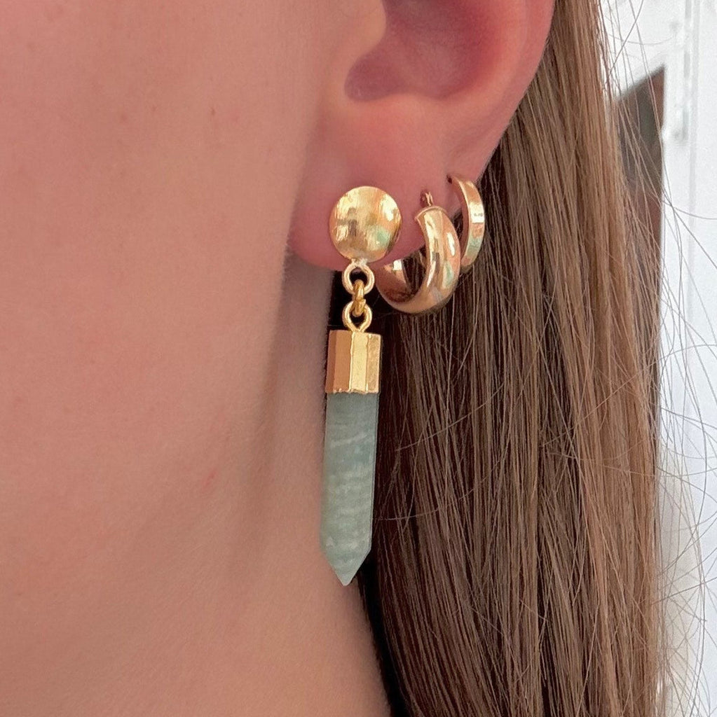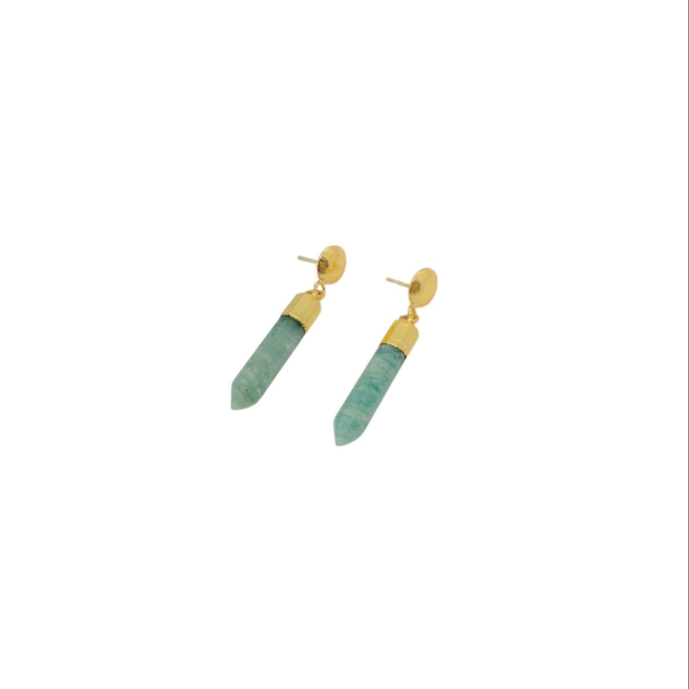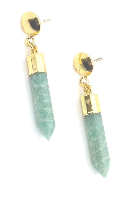 Our Coco earrings have beautiful single spike drop made of Amazonite. The stone is attached to a modern round gold filled post. A fun beach vacay earring or add a pop of color to any dark ensemble with this modern style.