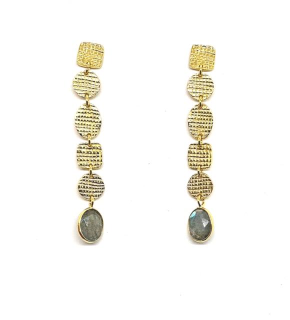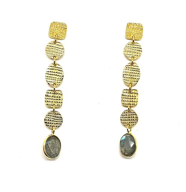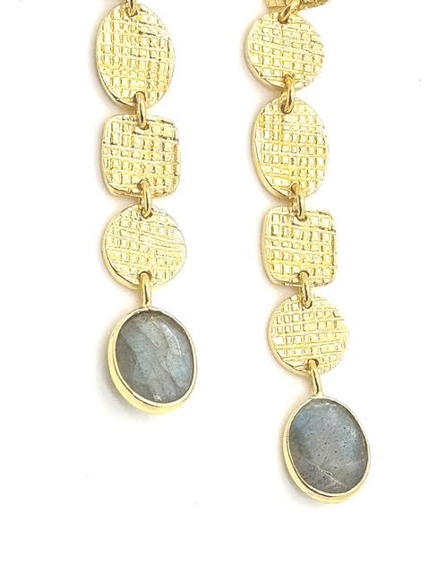 Hammered 14K gold plates cascade with sculptural elegance, culminating in a single, iridescent labradorite that captures the eye with its transformative glow. Minimalist in form yet rich in presence, this piece celebrates the quiet magic of labradorite—shifting, luminous, and endlessly captivating.