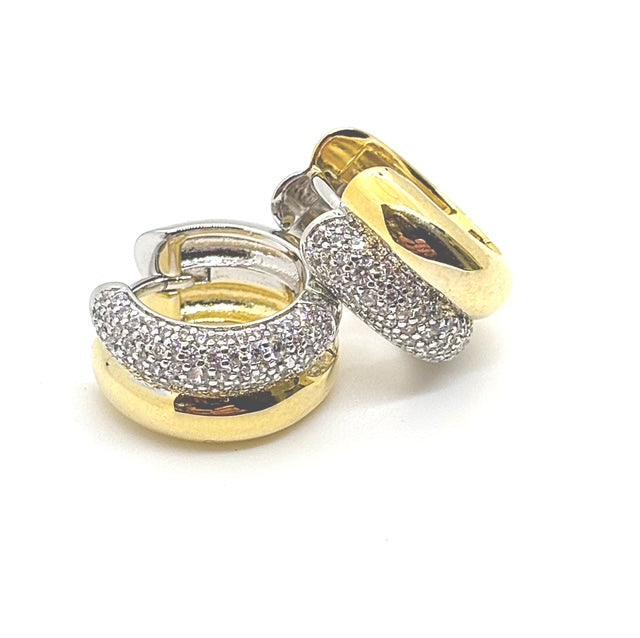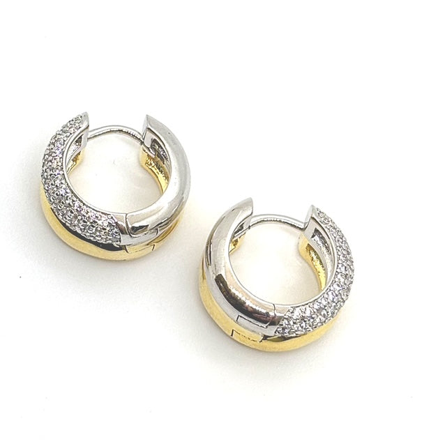 Meet your new favorite everyday earring. Our Gemini huggies feature a mixed metal design with pave white topaz. These are the perfect addition to your collection.