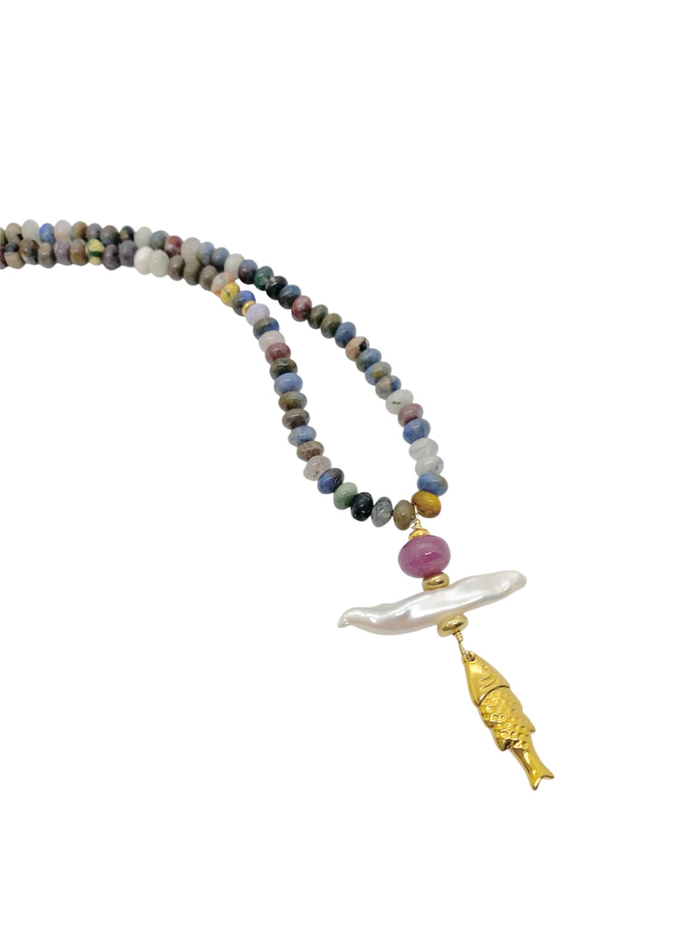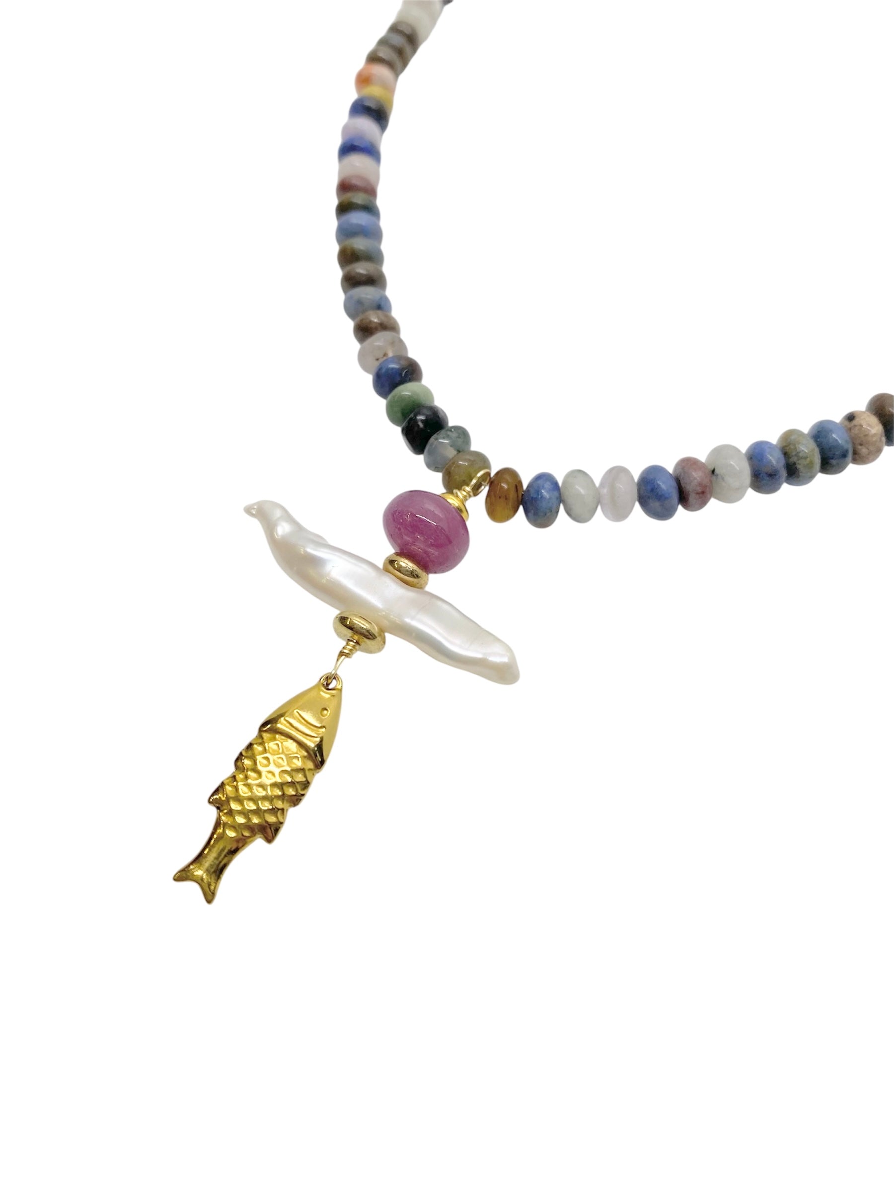 Colorful, captivating, and full of meaning — the Jewel Tide Necklace is a celebration of texture, tone, and charm. Hand-strung with multi-colored Jasper beads, this one-of-a-kind piece features a whimsical Pink Sapphire stone, goldfish charm and an iridescent Biwa Pearl pendant, bringing together playful elegance and earthy beauty. Enclosed with a 14K gold filled lobster clasp.