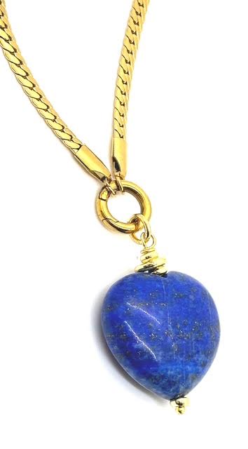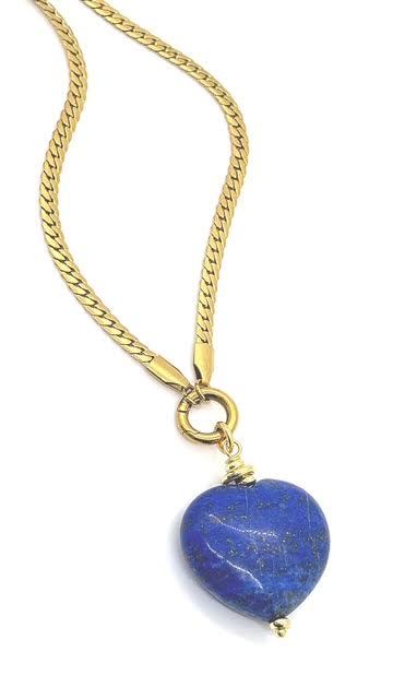 Our Lapis Heart Charm channels a sense of regal allure with its rich, celestial blue tones and mesmerizing flecks of pyrite. Revered for inspiring self-awareness and inner wisdom, this striking gemstone brings both beauty and intention to your collection. Exquisitely showcased on our braided gold link chain, it is a piece that feels as powerful as it looks.