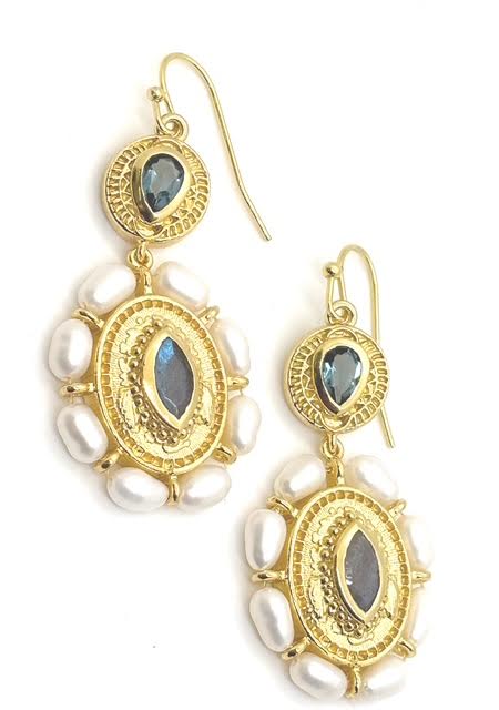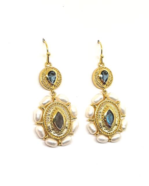 Masterfully crafted with iridescent Labradorite, London Blue Topaz and heirloom-quality pearls, with gold accents. Our Pearl London drop earring is a one of a kind gift for that special someone. The earring embodies enduring sophistication.