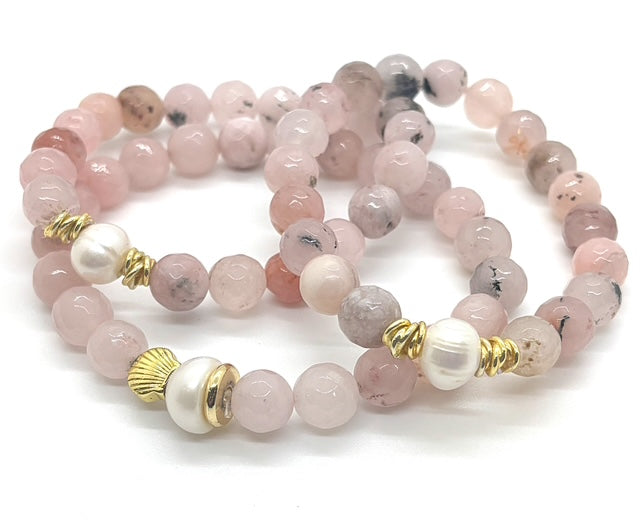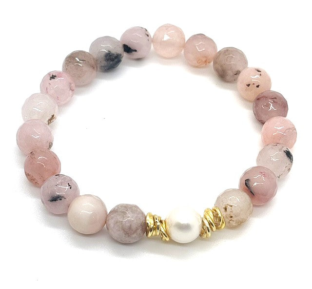 Colorful Pink Opal stones are accented with small gold rope accents and a single white freshwater pearl adding some shine. The bracelet makes a statement in a soft feminine way. Wear multiples or pair with gold bangles! Each is unique, color and markings may vary.