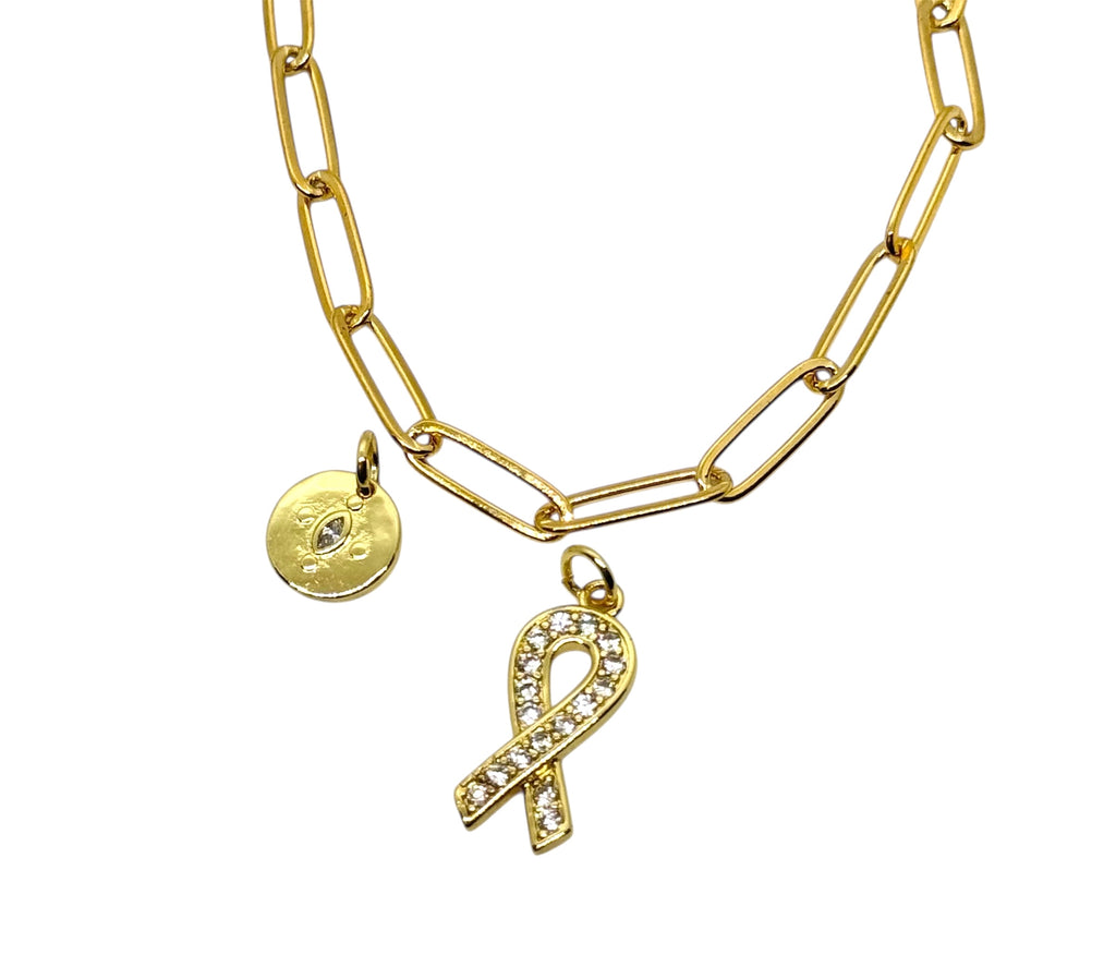 A pave White Topaz ribbon charm signifies Hope and to shows support of those with cancer. A small reminder of Hope to wear with you daily.