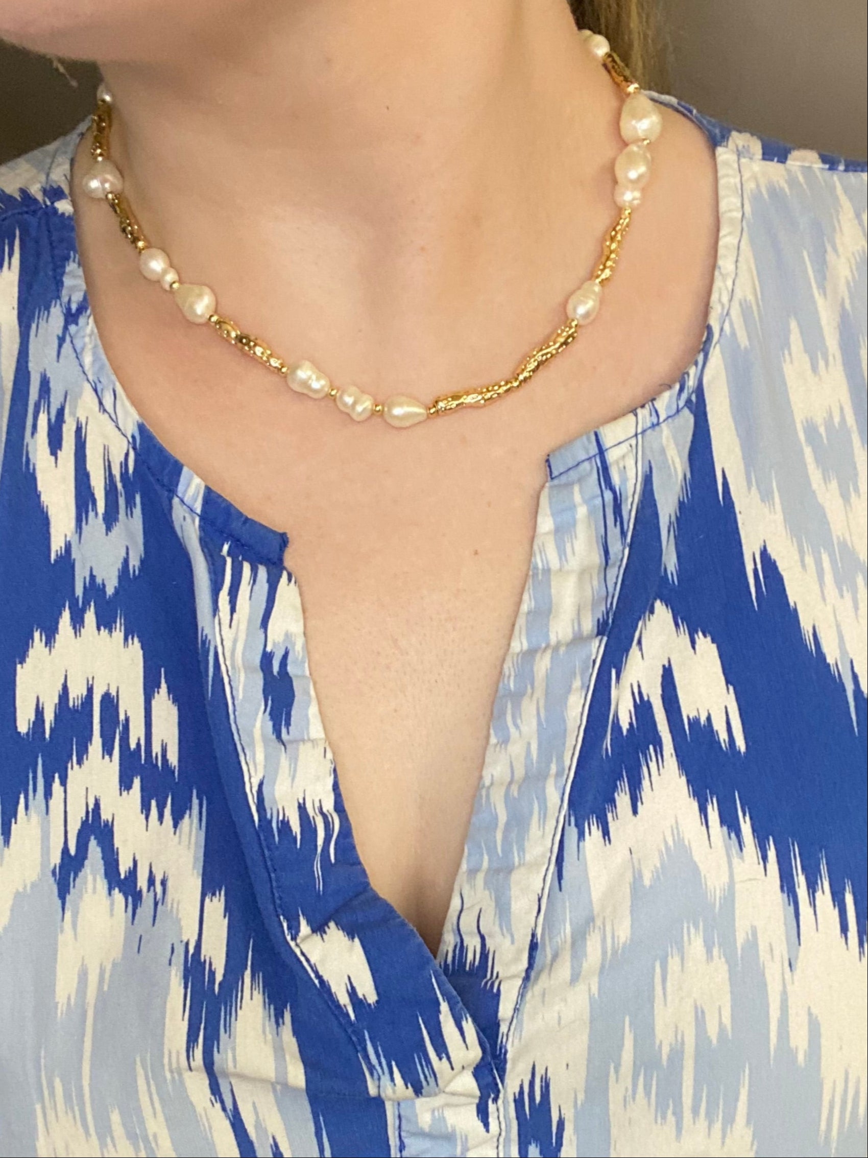 Classic with a modern glow, the Solenne necklace brings a fresh elegance to your everyday jewelry wardrobe. Hand-strung with radiant Freshwater Pearls and accented by gold-fill textured spacer beads, this 18" strand adds soft luster and warmth in perfect proportion. Finished with a delicate extender for adjustable length, Solenne is ideal for layering or wearing solo. Features a lobster clasp.