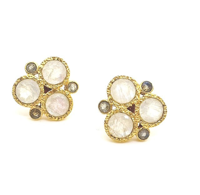 Our Divine studs are a gorgeous cluster of Moonstone and Labradorite set in a textured gold filled bezel. These stones are colorful and flashy when light interacts with them. These beauties instantly add elegance to any outfit.