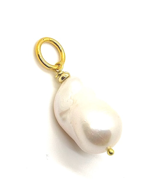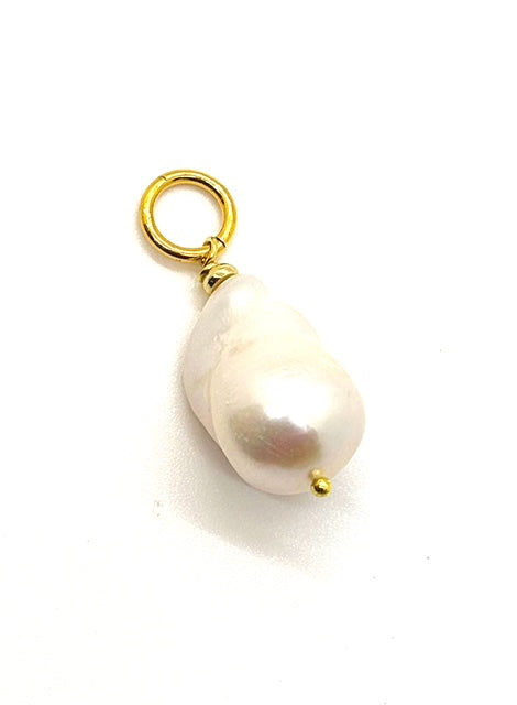 Our Baroque charm features a single AAA grade bright white pearl. A simple gold loop at the top allows this to be strung onto a chain, metal collar or charm lock on any chain. Each pearl is natural and color shape and size may vary slightly. Listing is for one pearl charm only, chain and lock sold separately. Each is unique, color, shape and size may vary.