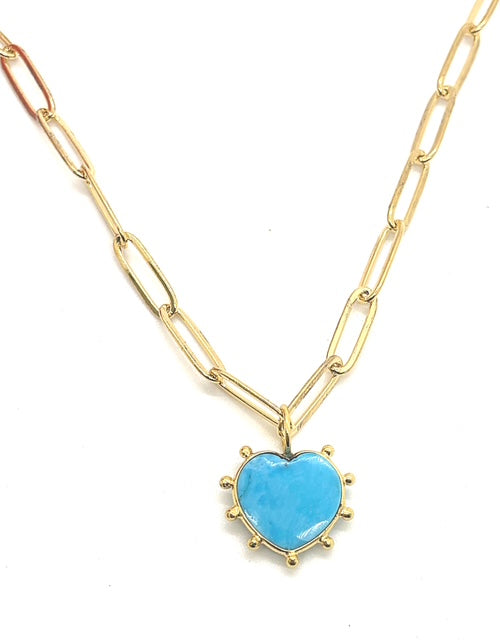 Our Heart of the Sea necklace features a decorative chain accented with a one of a kind gemstone charm. The colorful Arizona Blue Turquoise heart is set in a studded gold bezel setting and hangs from our best selling luna chain which is adjustable. The loop at the top allows for the charm to be removed and worn on other chains easily.