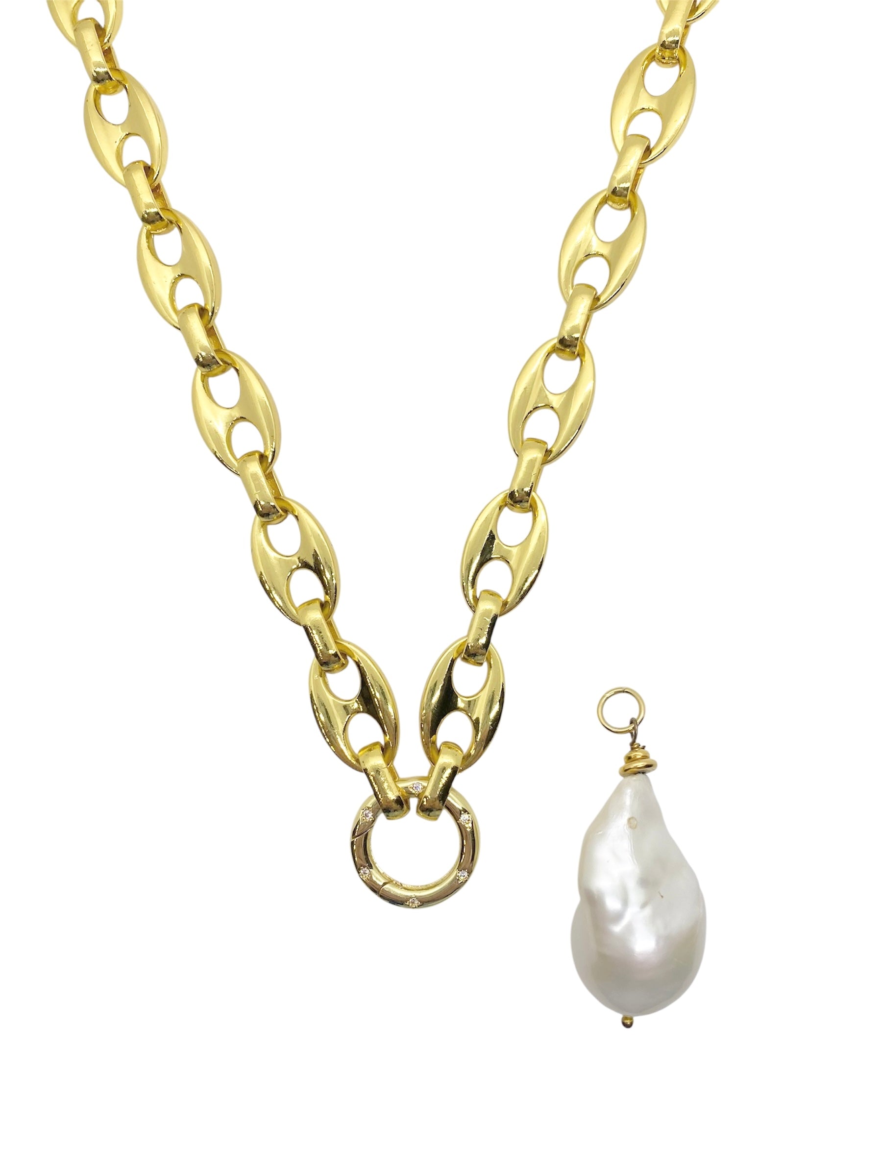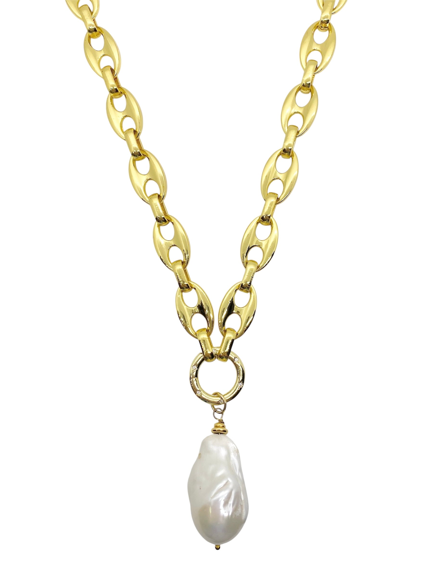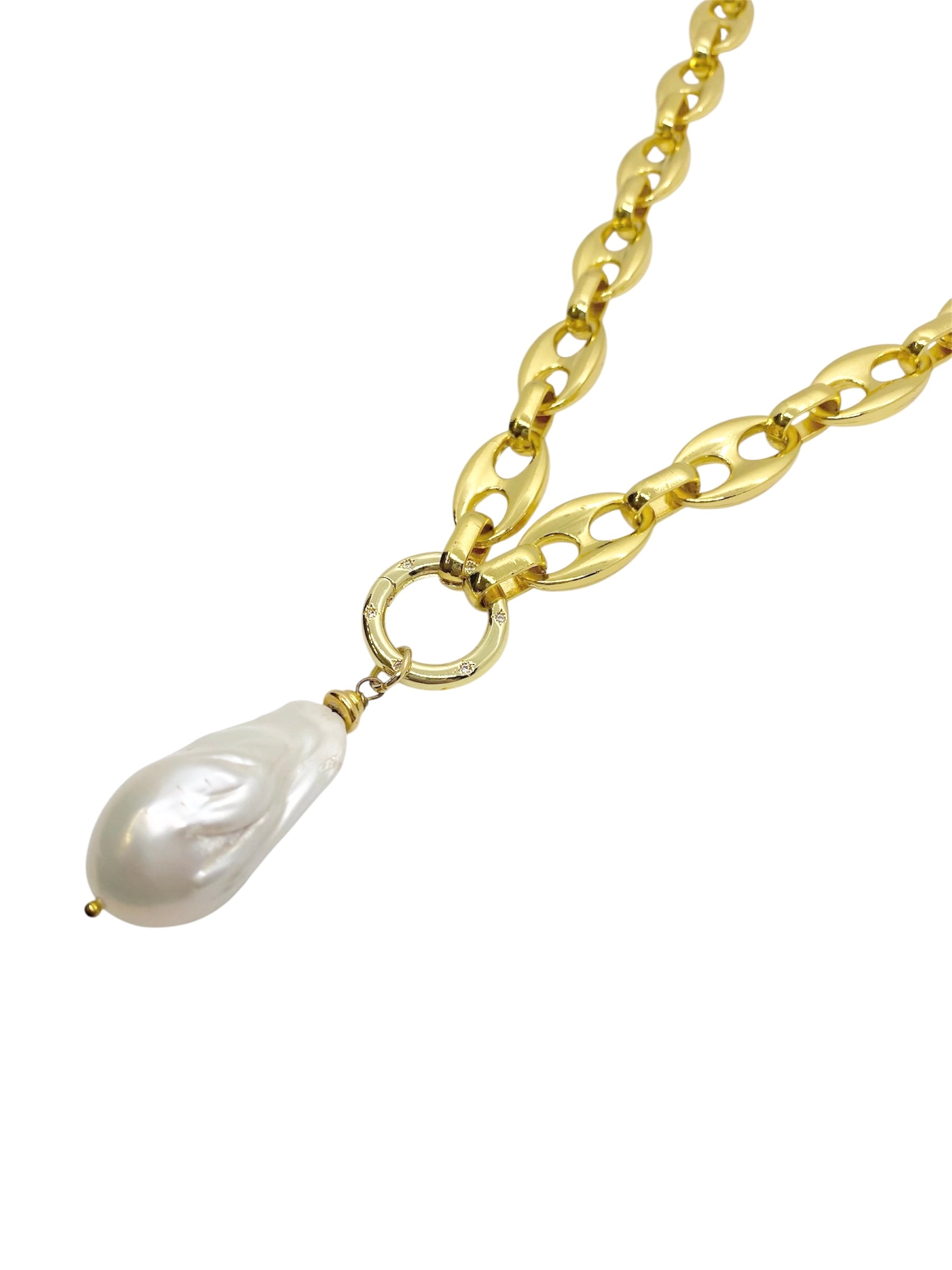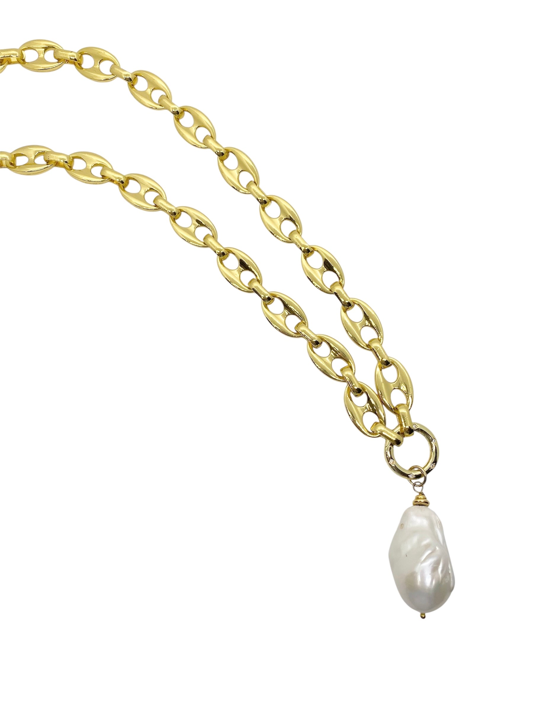 Make a bold yet timeless statement with this striking necklace. Featuring a chunky high-polish gold link chain, it’s designed to catch the light and elevate any look. At the center, a luminous baroque freshwater pearl pendant hangs gracefully, adding a touch of organic elegance to the modern edge of the chain. For maximum versatility, interchange the pendant or wear the chain solo. Each pearl is one-of-a-kind, making every necklace uniquely yours.