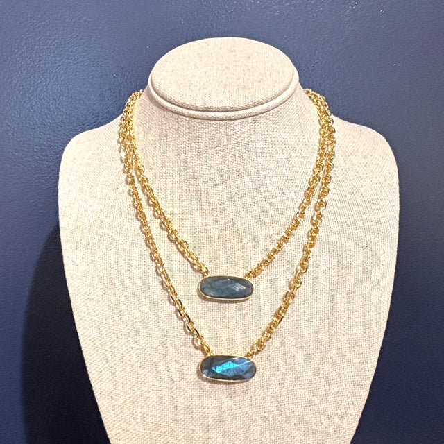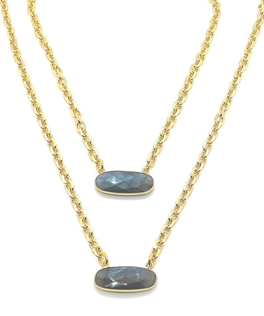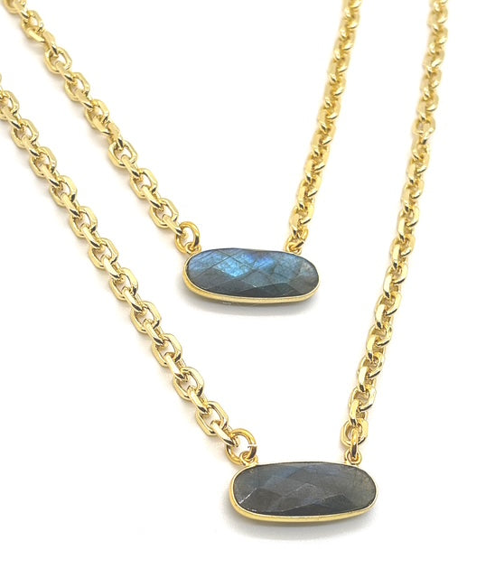 Our Laney piece features a stunning gold chain that showcases a gorgeous faceted Labradorite pendant. Labradorite is known for its beautiful hues of blue, green, and purple. Perfect for layering and adding a pop of color to your wardrobe.