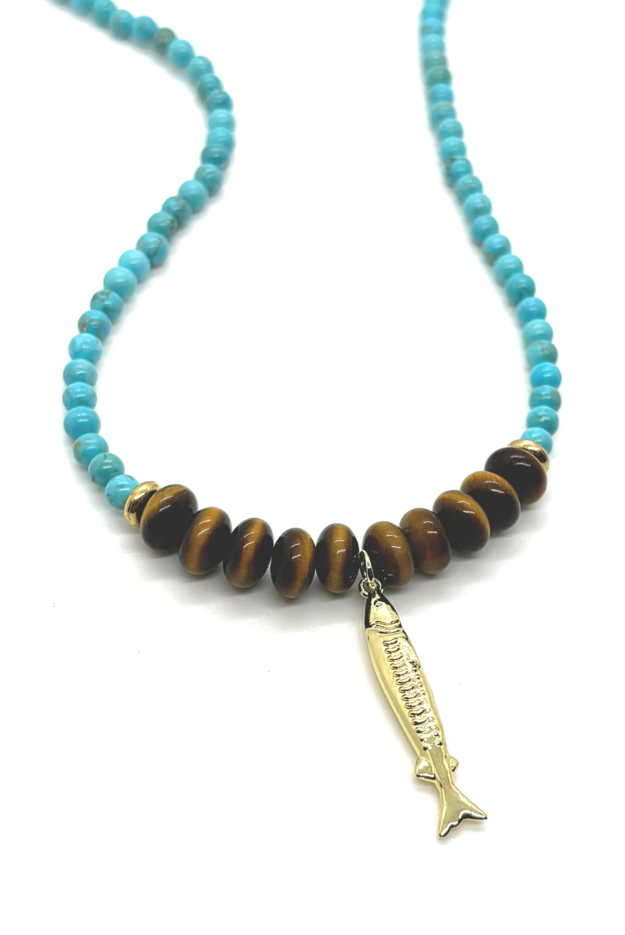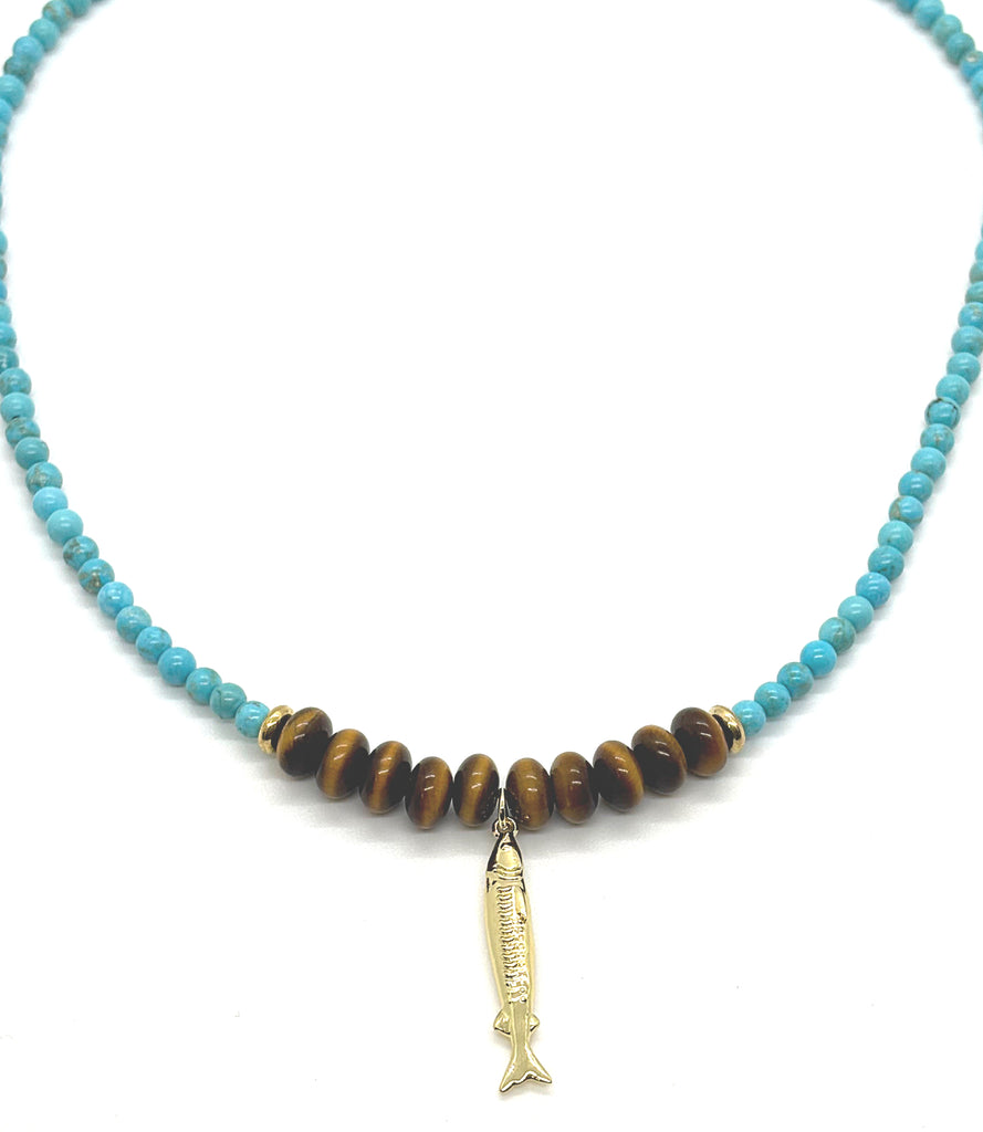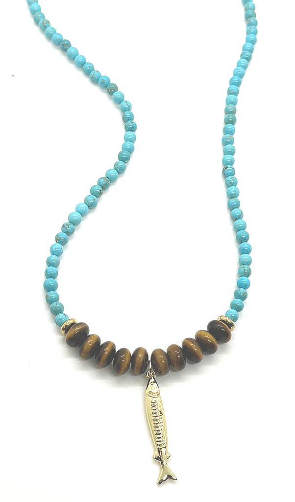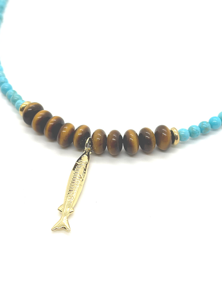 The Tide necklace features pale blue turquoise accented with tiger eye and a fun gold fish accent. Wear this necklace alone or layer with a gold chain and additional charms. Pair with a gold hoop or turquoise drop earring.