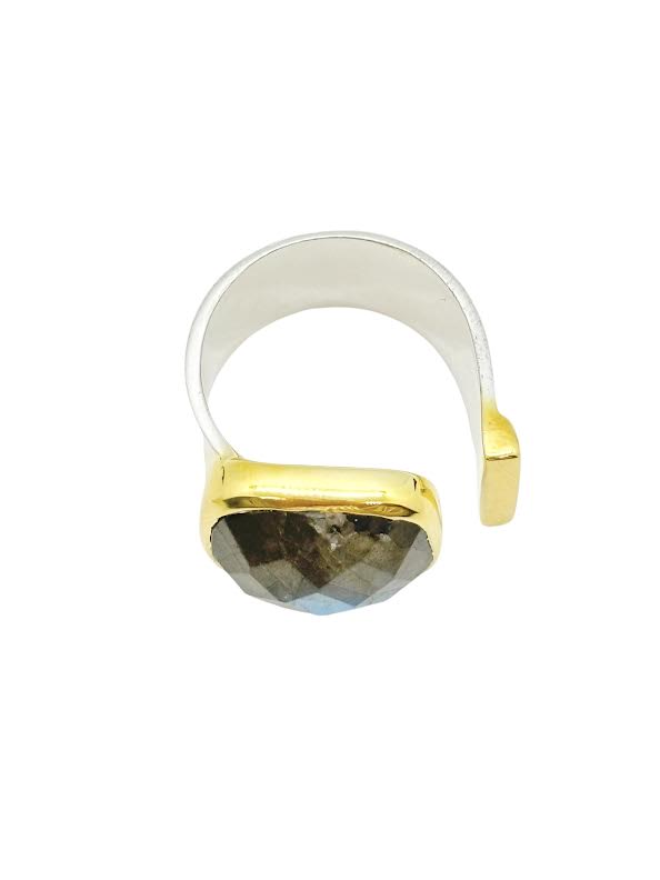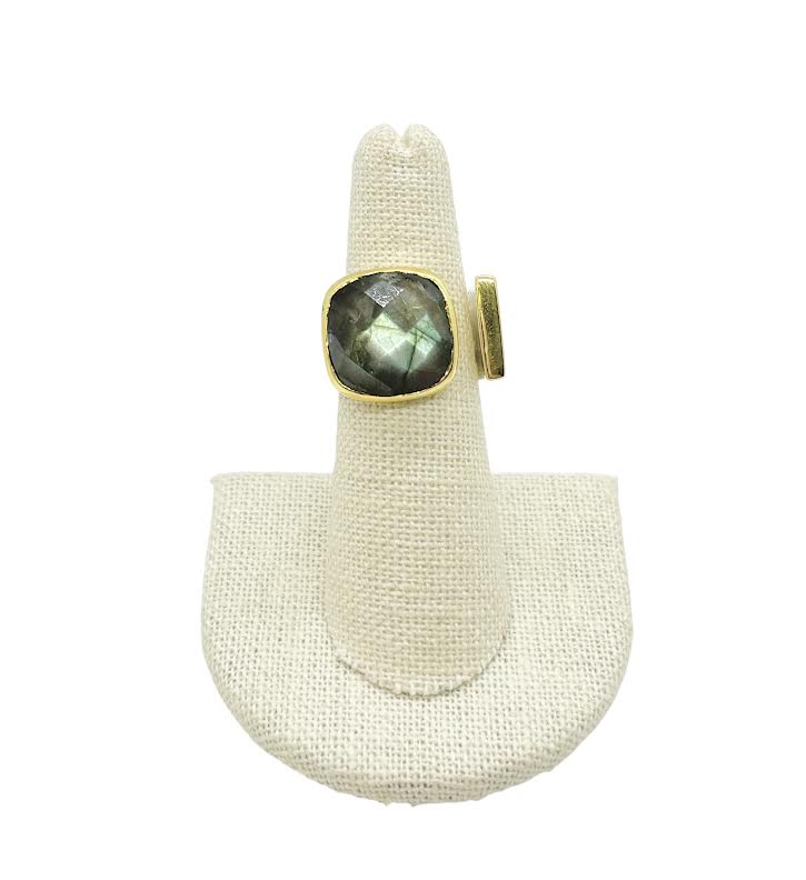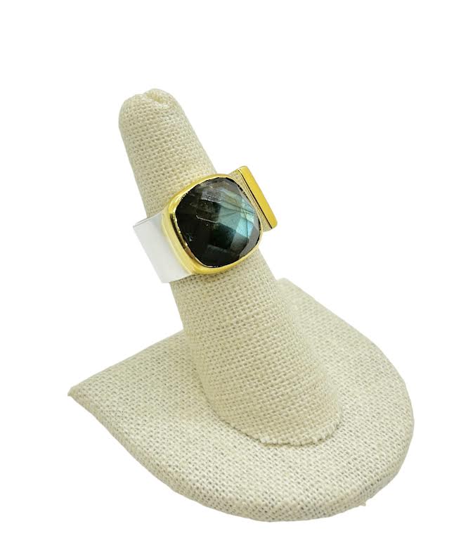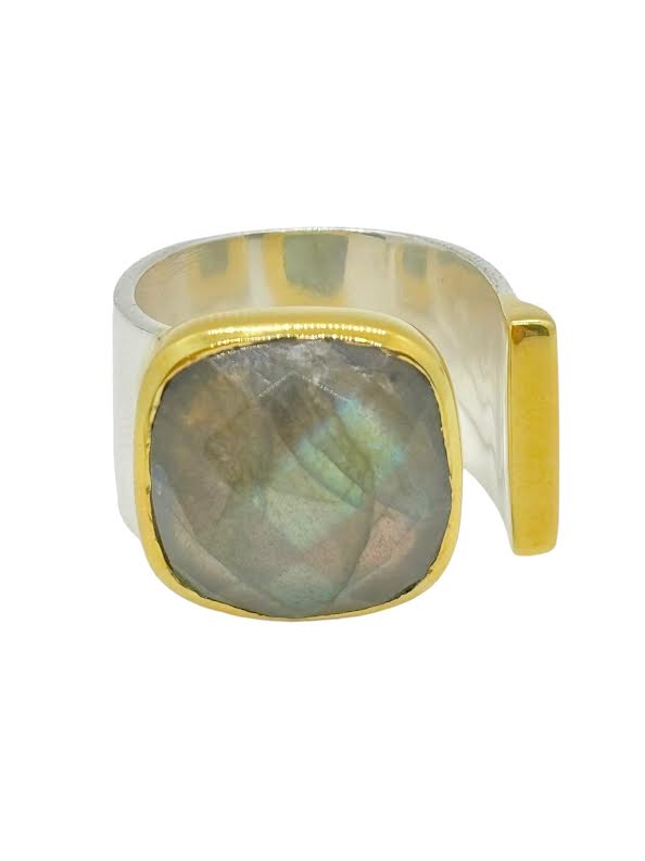 The Laramie features a large faceted Labradorite set in a modern mixed metal setting. Each stone is unique and the color the stone pulls will vary. A deep grey stone has flashes of green, blue and deep purple. A unique piece to wear and enjoy daily. This adjustable style allows for endless options for wear.
