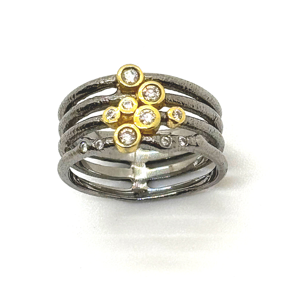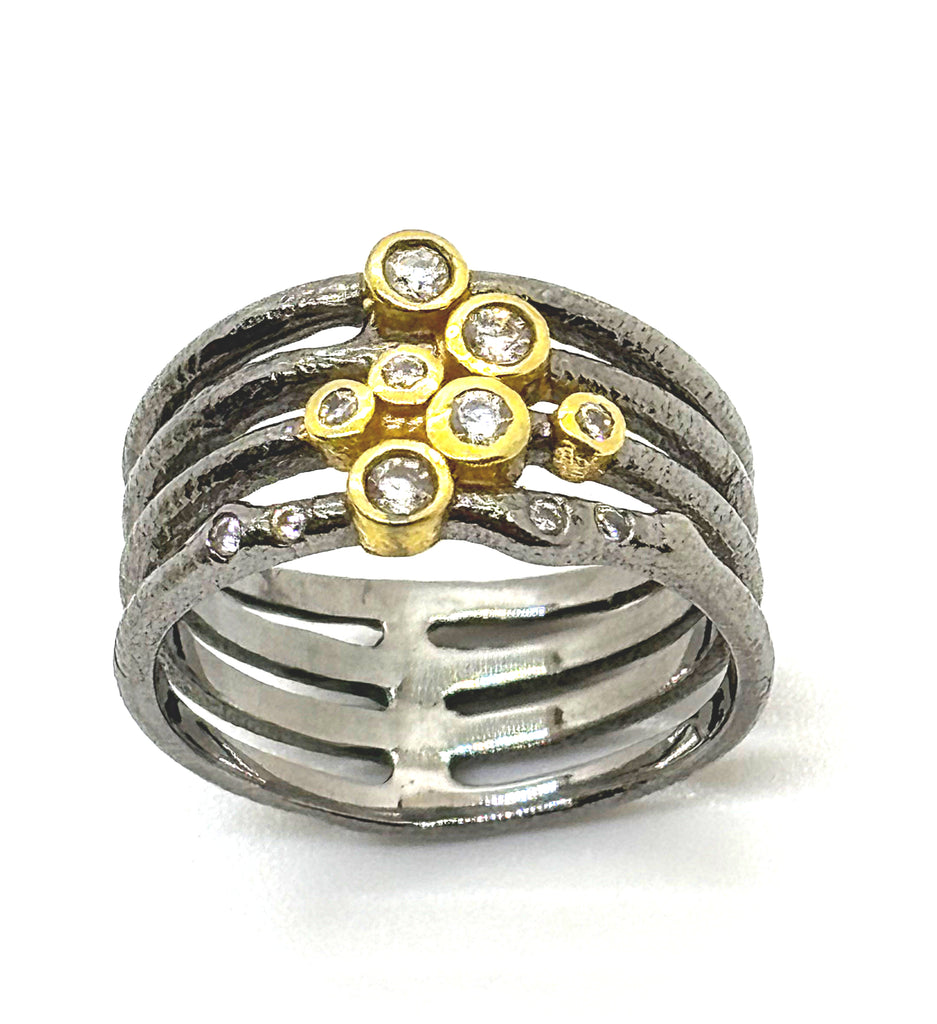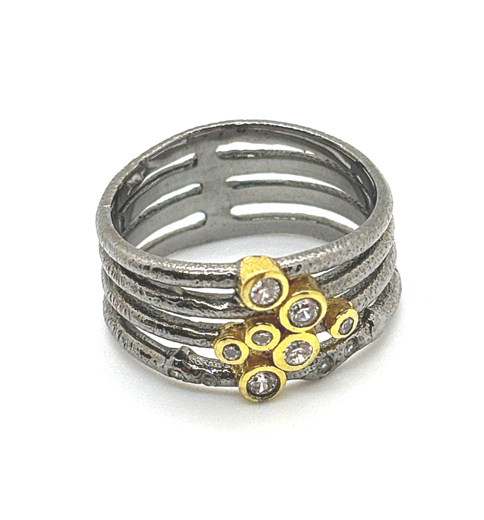 Our Yin and Yang ring brings two halves together to create this unique piece. The band made of multiple oxidized sterling silver bands are joined and inlaid with shimmering White Topaz stones bezel set in gold. A unique style for the modern woman.