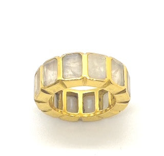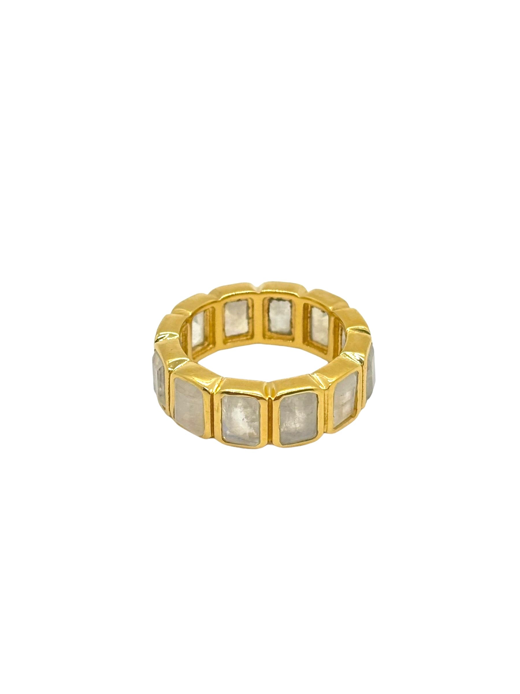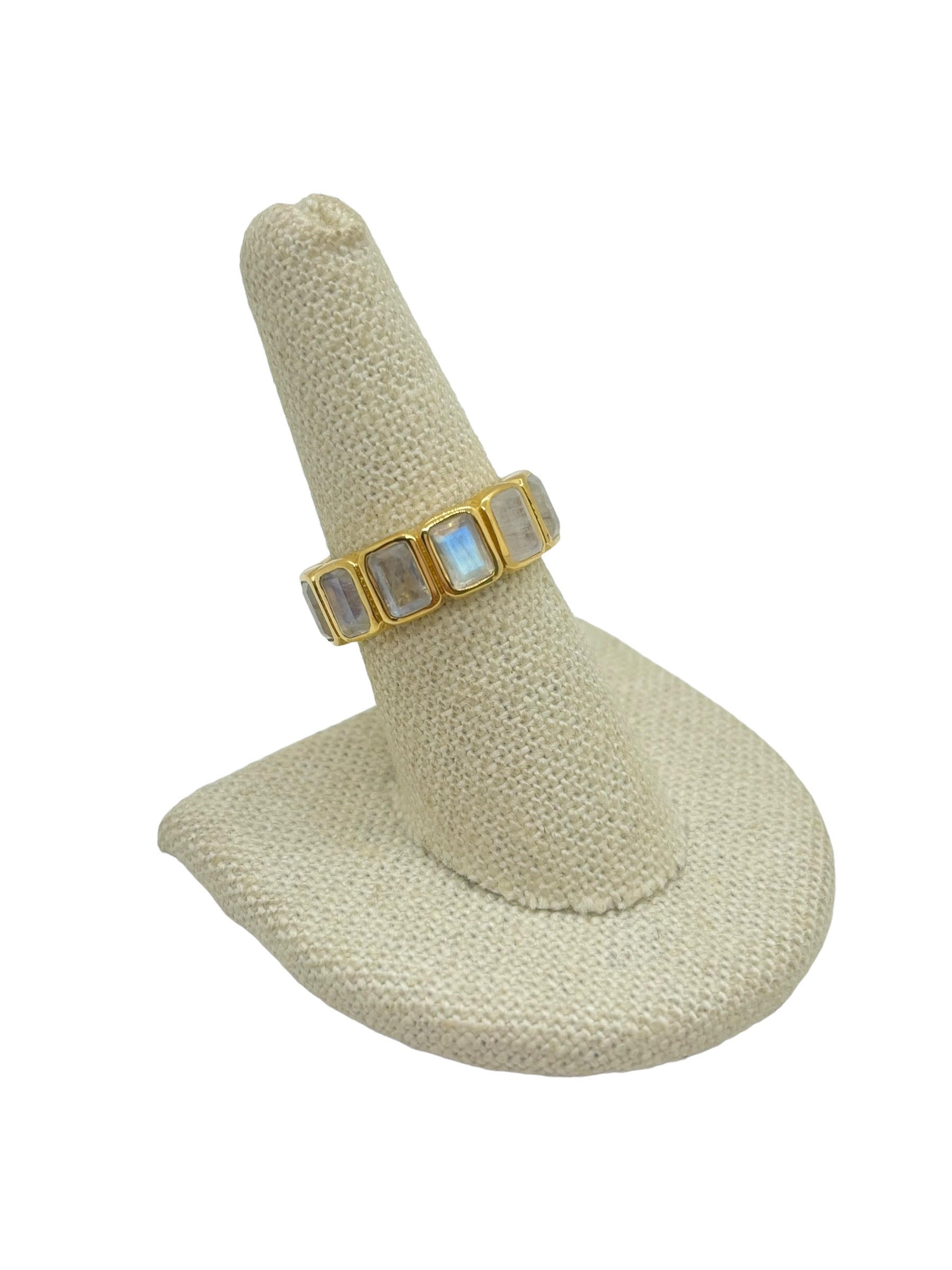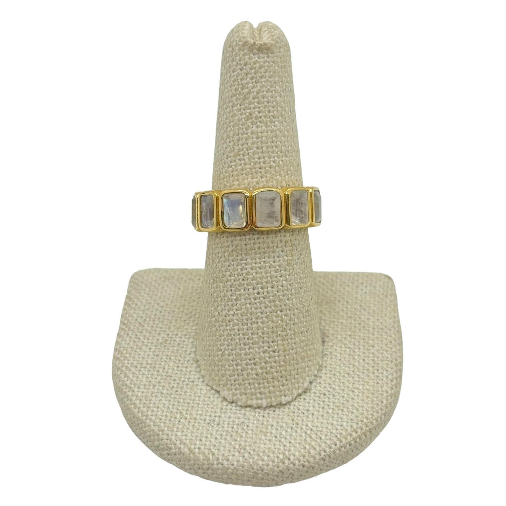 Our best selling Moonrise ring features large emerald cut Moonstones. This stone is known for it's iridescent color changes  showcasing deep blues, purple, green and even peach. The stones are set in a modern low profile style making daily wear a breeze. The stones run around the entire band creating a luxurious look. A fun statement ring to wear on your middle or index finger for a unique look. Gold filled