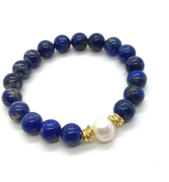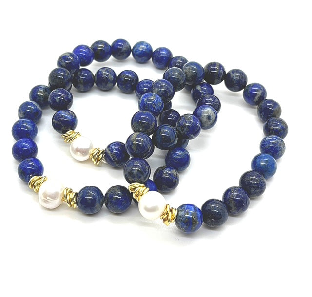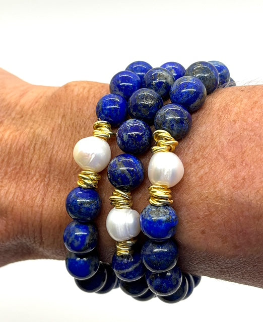 Our Indigo bracelet is a best seller featuring deep Lapis Lazuli. Each stone showcases a rich, saturated hue that evokes the depths of the deepest ocean, while delicate gold accents and a single white pearl adding contrast. This sophisticated piece seamlessly transitions from day to evening wear, offering a refined touch to any ensemble.