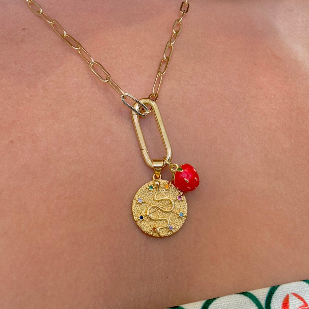 The Alani piece is a gold filled charm with enamel. This berry is perfect for any summer stack.