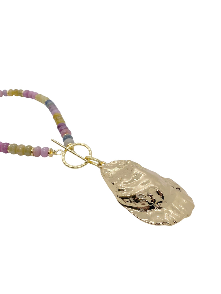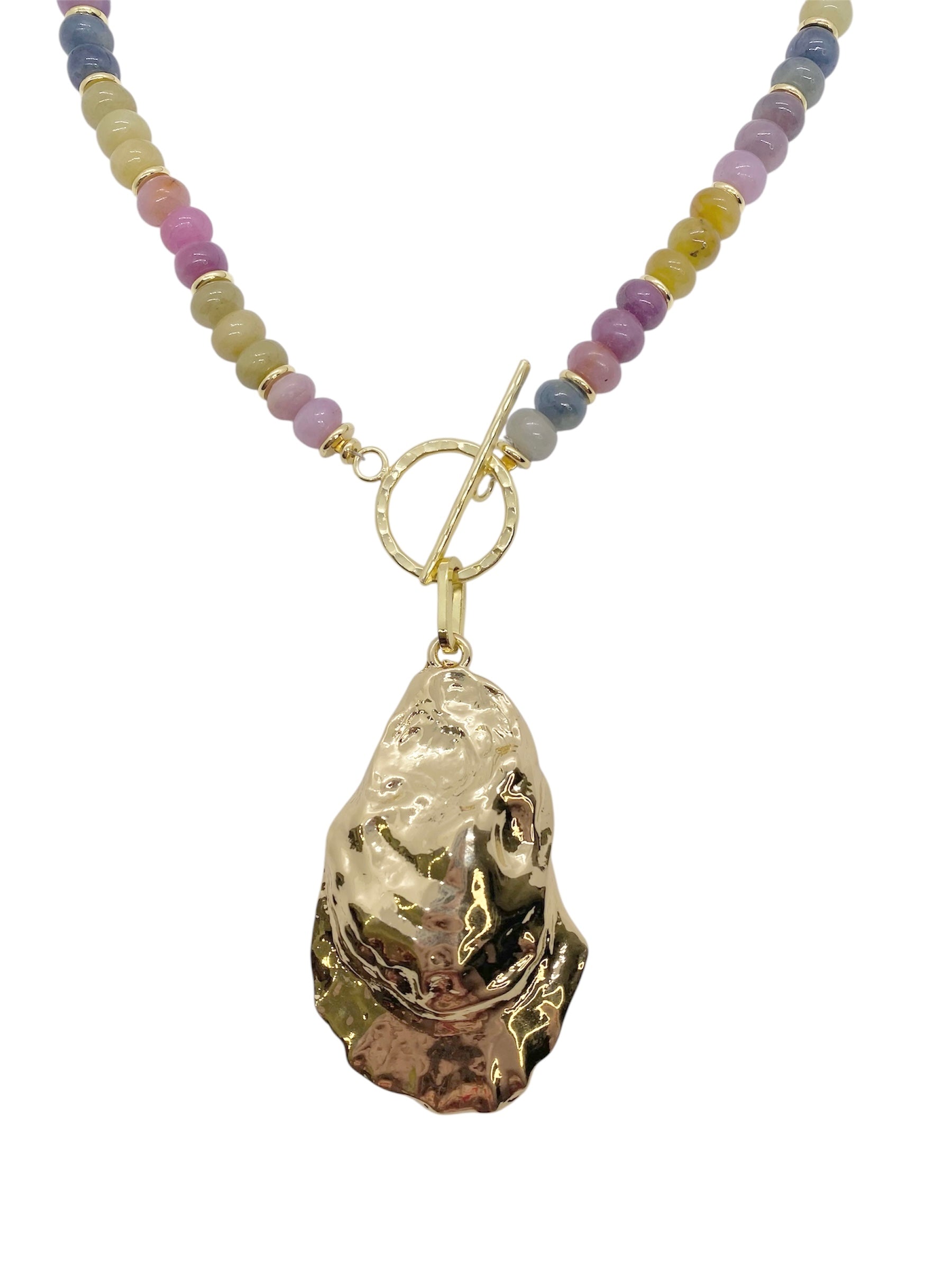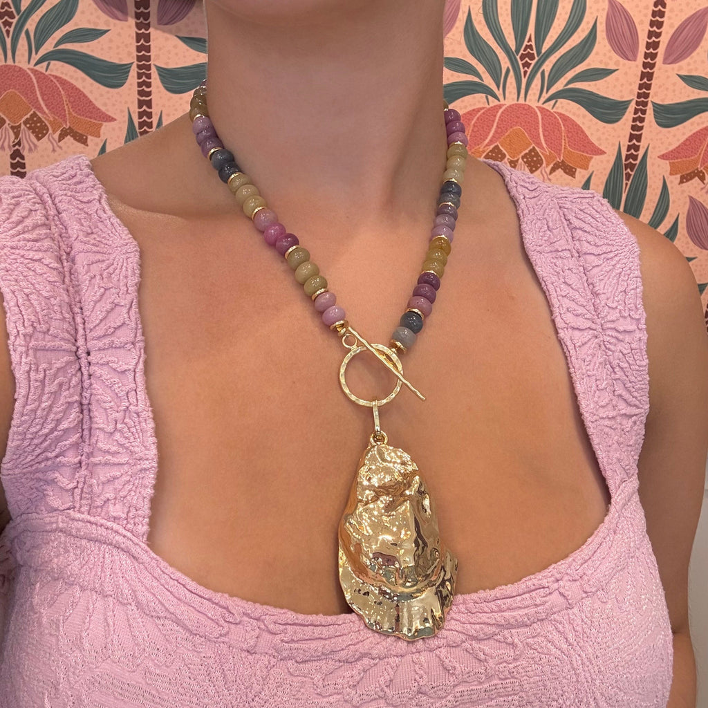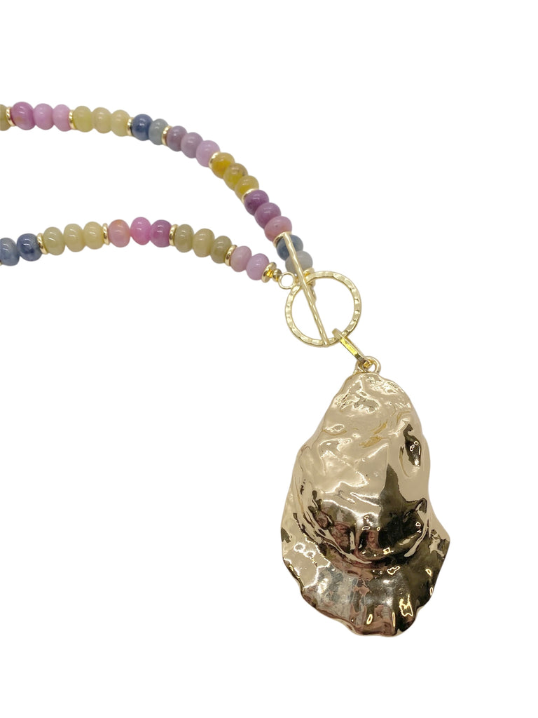 This piece features an array of colorful Sapphire stones, with a large gold filled shell. Our Kacey necklace is the perfect statement for any summer occasion. Front hammered textured toggle closure.