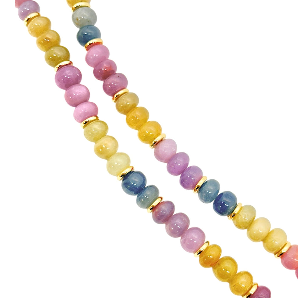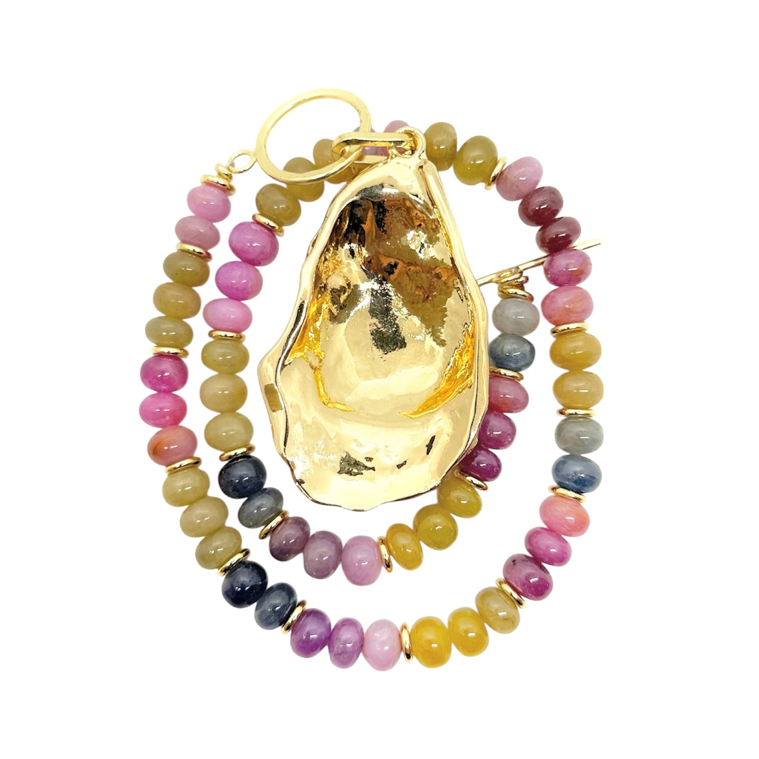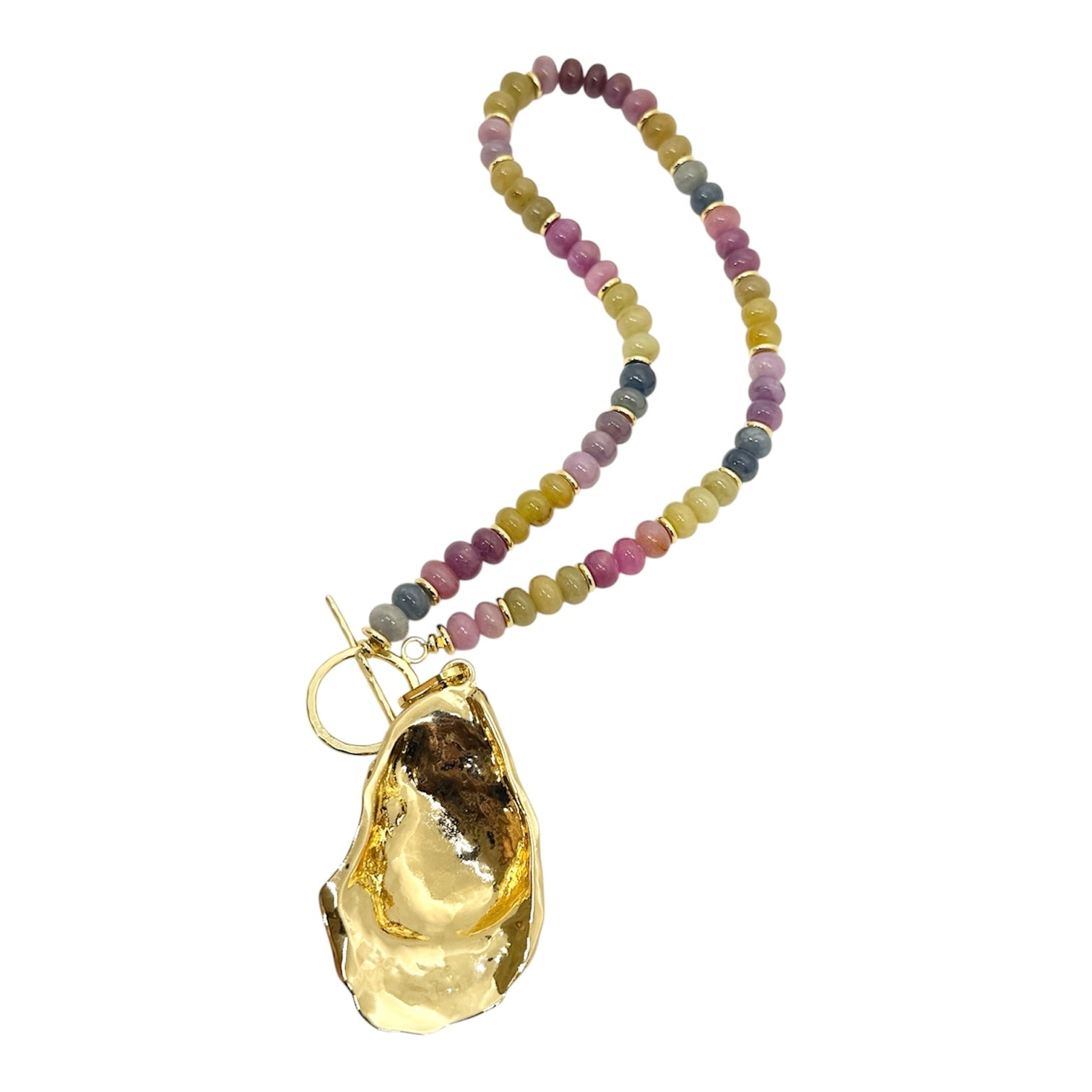 This piece features an array of colorful Sapphire stones, with a large gold filled shell. Our Kacey necklace is the perfect statement for any summer occasion. Front hammered textured toggle closure.
