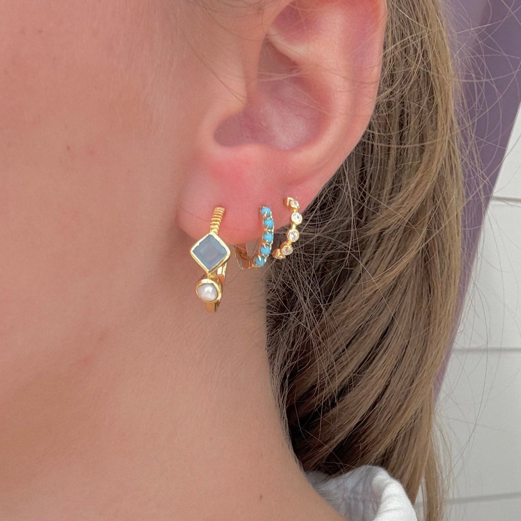 Our best-selling gold-filled micro hoops feature delicately inlaid White Topaz, adding a subtle shimmer to your everyday style. Effortlessly elegant and lightweight, these dainty hoops are perfect for daily wear or paired with a solitaire stud for a chic, layered look. Post back closure.