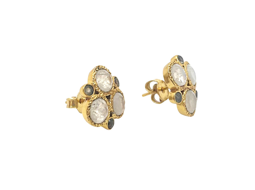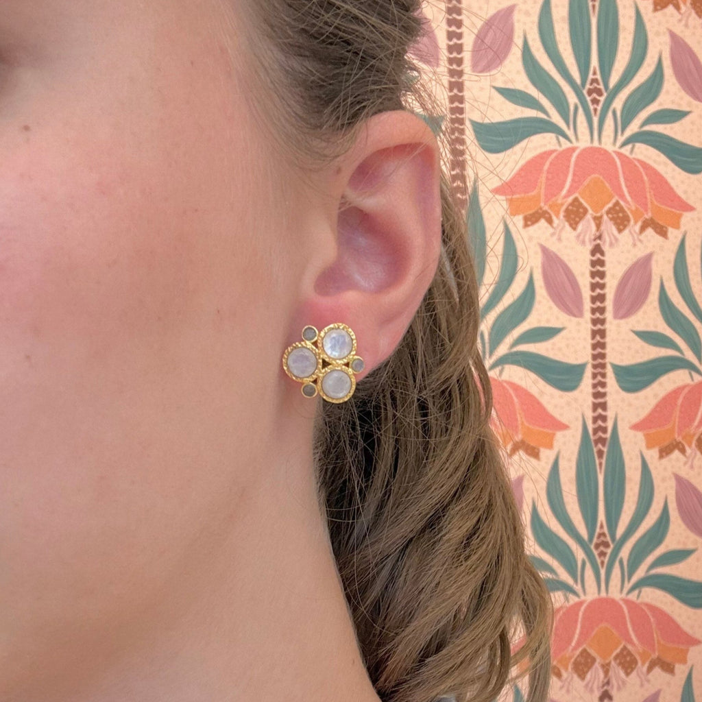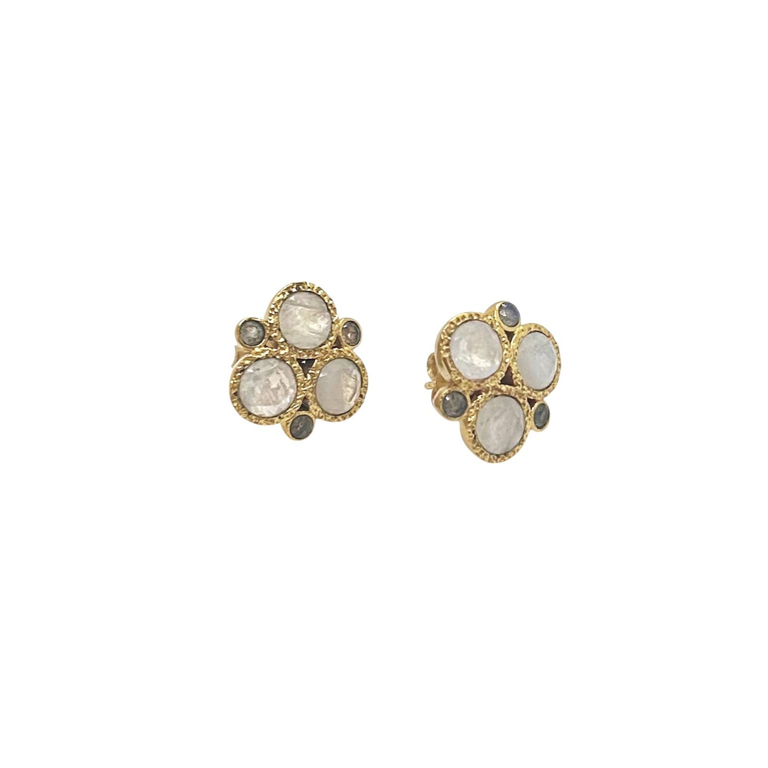 Our Divine studs are a gorgeous cluster of Moonstone and Labradorite set in a textured gold filled bezel. These stones are colorful and flashy when light interacts with them. These beauties instantly add elegance to any outfit.