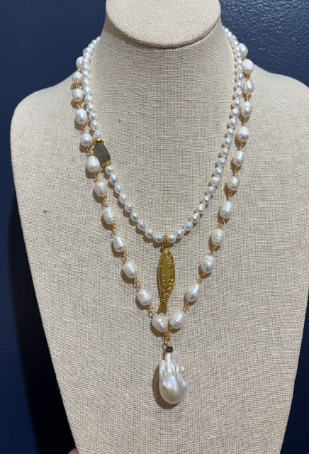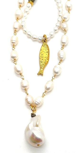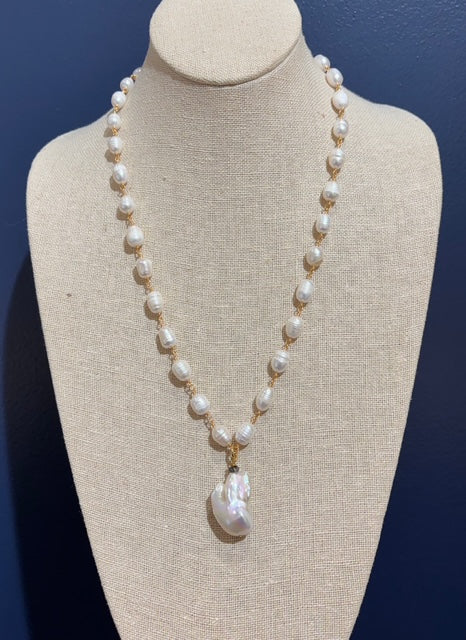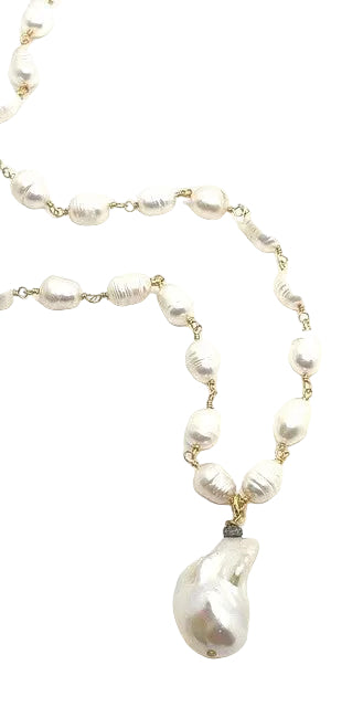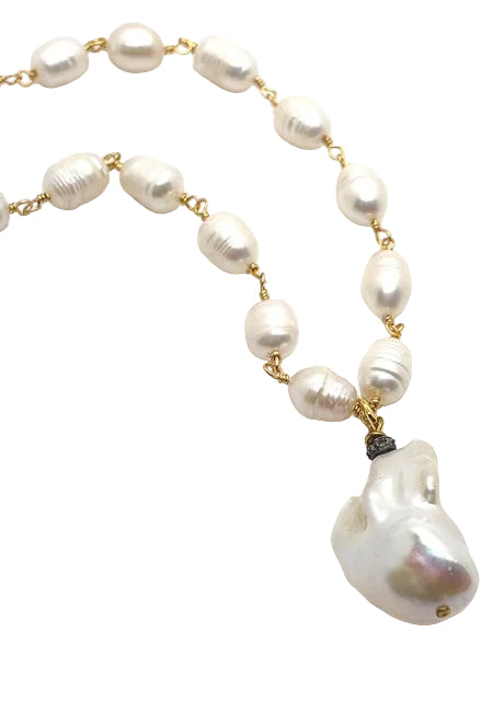 Our Tinsley necklace is a true classic. Hand beaded freshwater pearls are met with a single AAA grade baroque pearl. A diamond accent bead adds the perfect touch of sparkle. This piece would be the perfect addition to any collection.