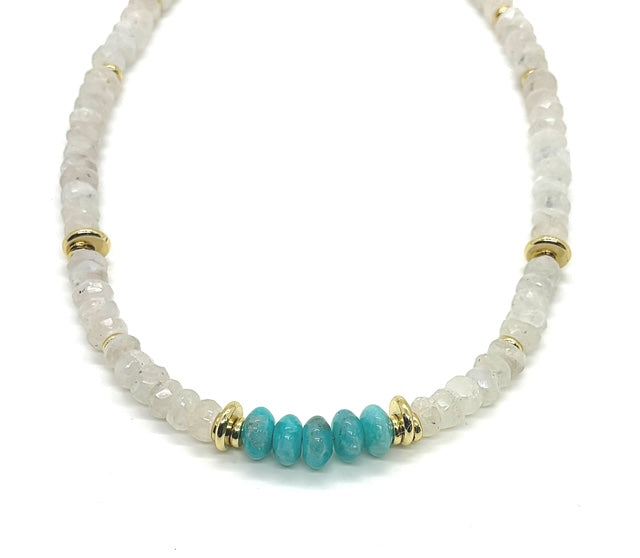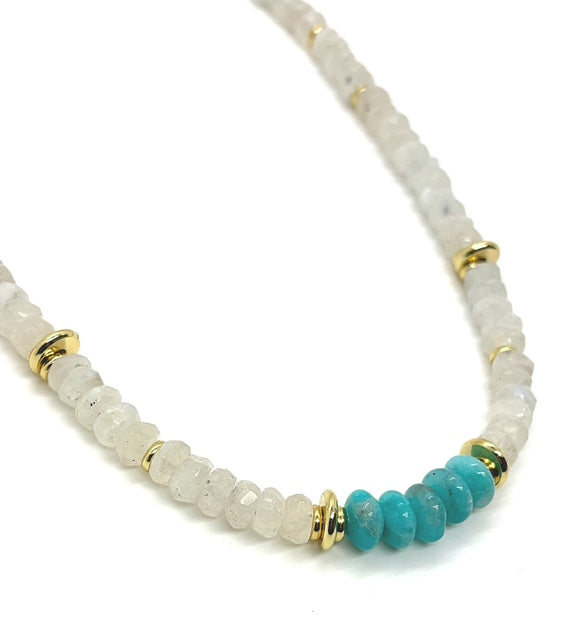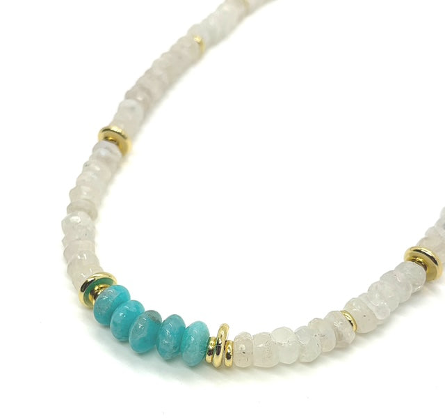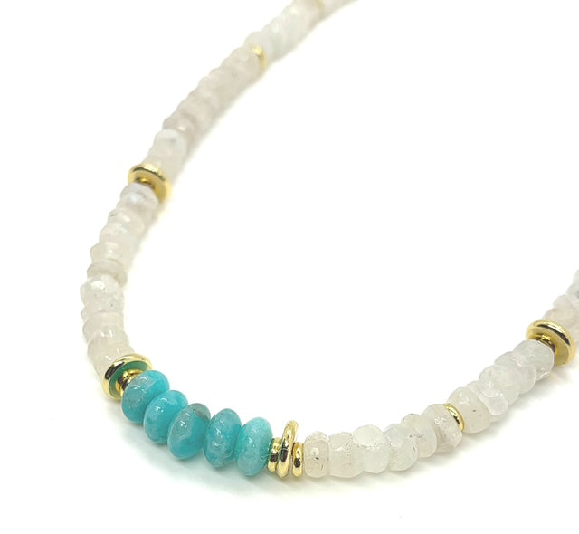 The perfect layering necklace with a pop of color to add to your stack. AAA grade Moonstone and Amazonite stones are hand beaded to create this essential.