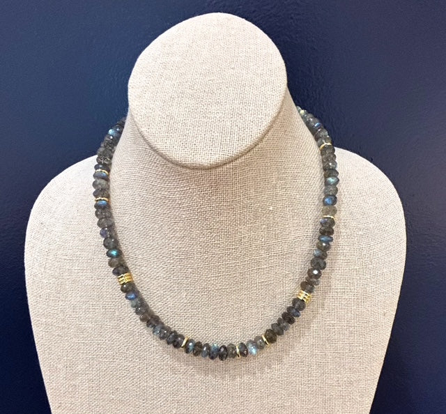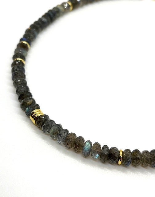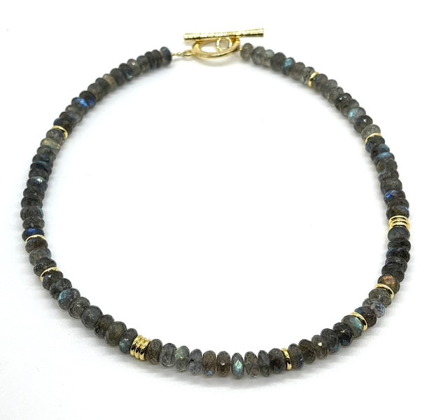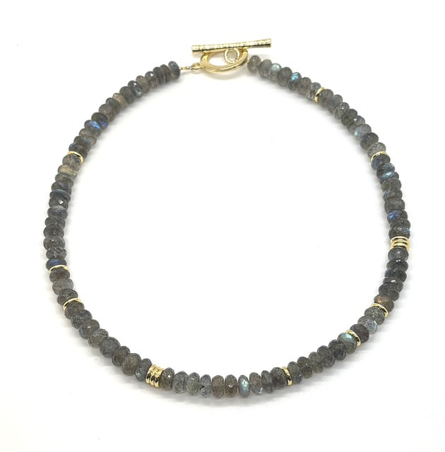 The Twilight Necklace features smooth, AAA grade iridescent labradorite beads that shimmer with flashes of deep blue, green, and silver. Gold-tone spacers add warmth and contrast, giving this piece a touch of elegance and modern edge. Gold filled toggle clasp closure.