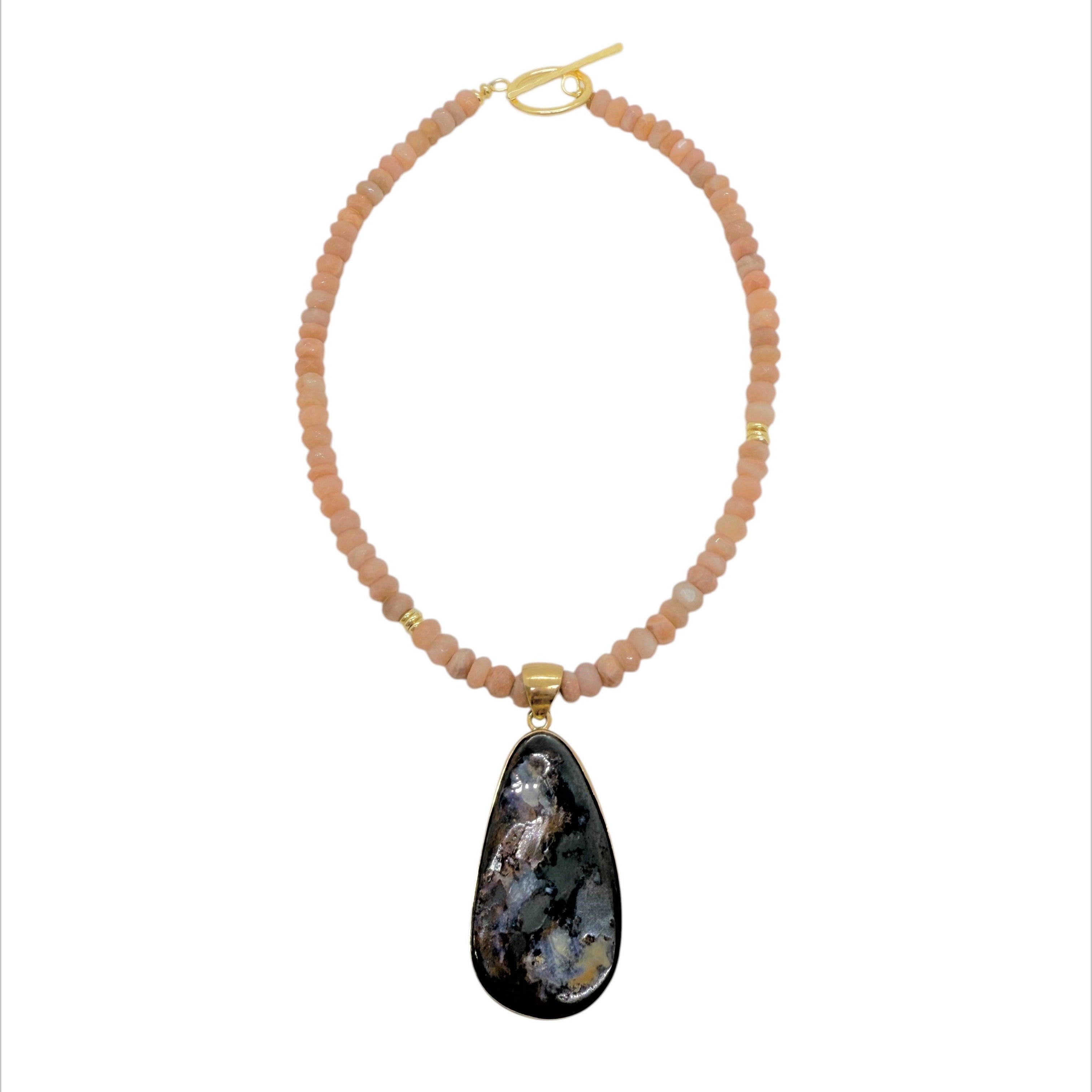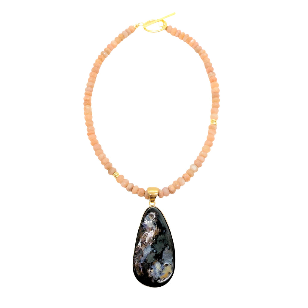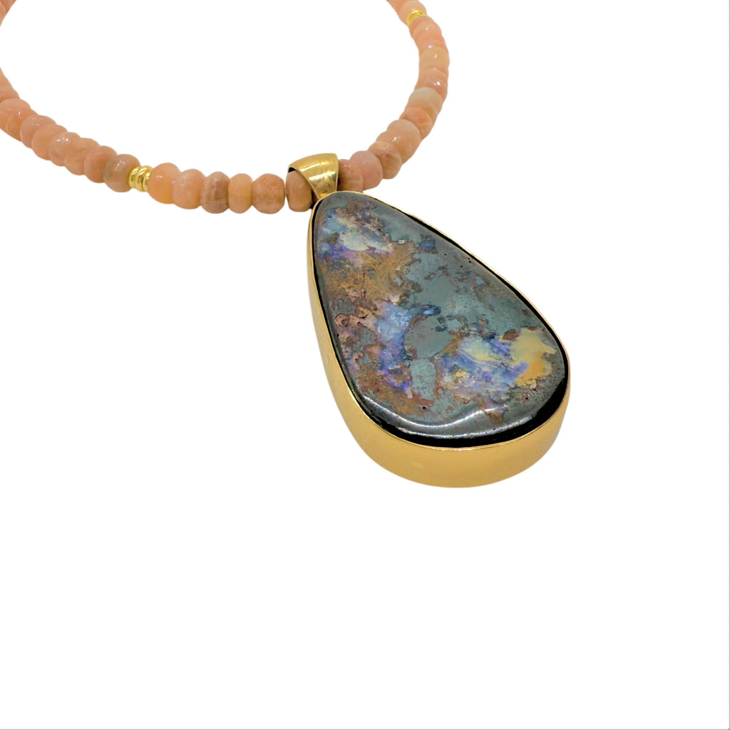 Our Boulder Opal necklace features a synergy of unique materials perfectly paired. Peach Moonstone in a faceted barrel shape are accented by an oversized bezel set Boulder Opal pendant. A unique one of a kind piece for anyone who wants to stand out. Toggle clasp.